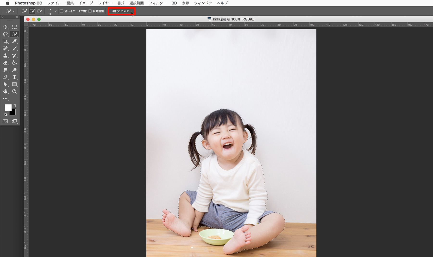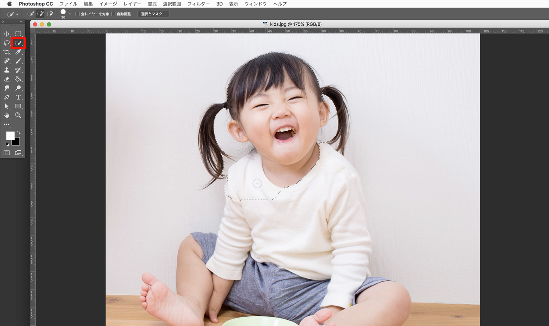 ツールバーの[クイック選択ツール]をクリックし、画像の中の選択したい部分をおおまかになぞると自動的に選択範囲が作成されます。