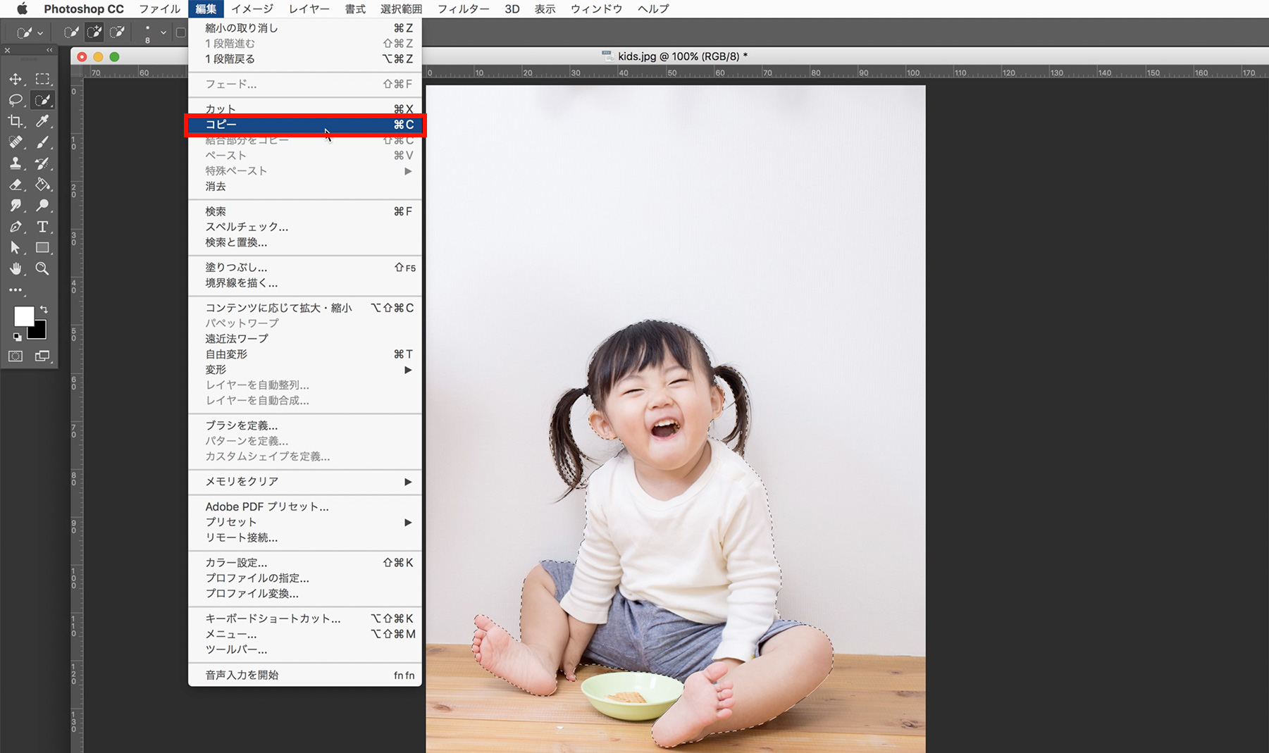 選択範囲が調整できたら、[編集]→[コピー]から選択範囲内の画像をコピーします。