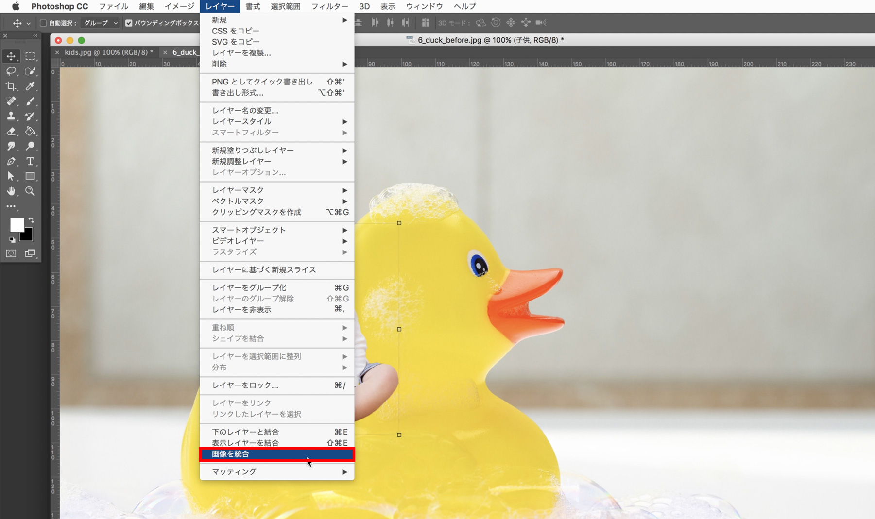 アプリケーションメニューの[レイヤー]→[画像を統合]をクリックしてレイヤーを統合します。