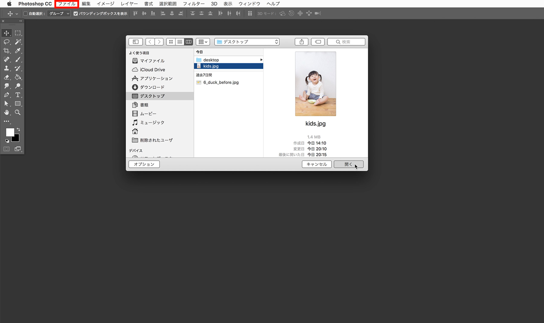 アプリケーションメニューの[ファイル] → [開く] をクリックして、切り抜きたい画像を開きます。