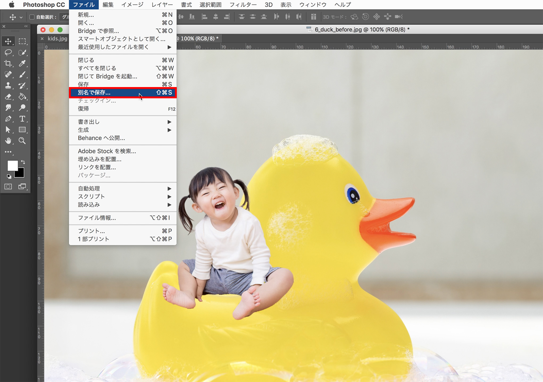 アプリケーションメニューの[ファイル]→[別名で保存]をクリックし、名前をつけて[保存]をクリックします。