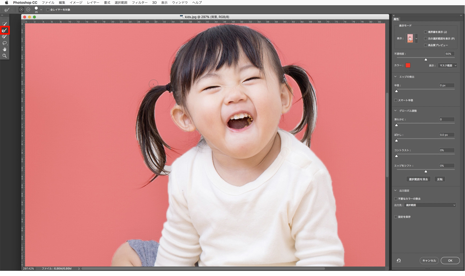 髪の毛などの細かい部分を選択するために、オプションバーの[選択とマスク]をクリックします。画面が[選択とマスク]ワークスペースに切り替わりました。