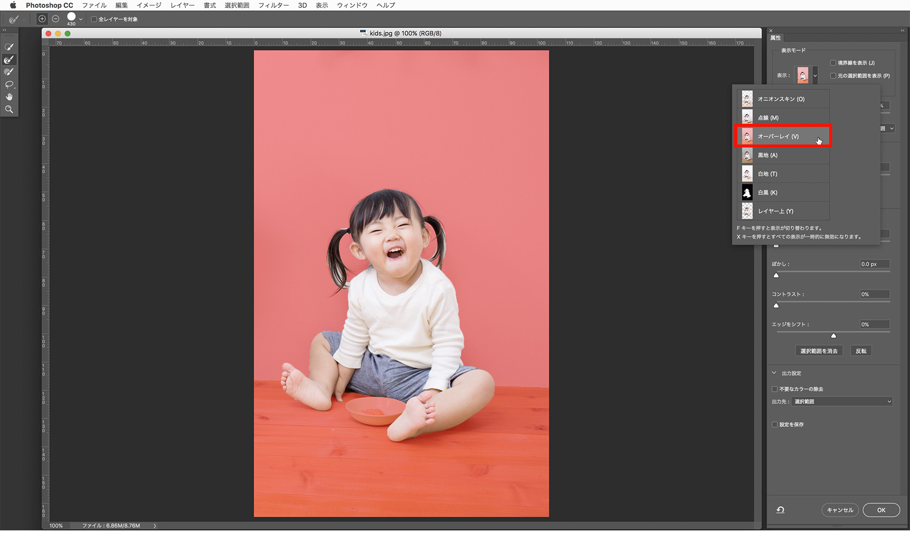 オーバーレイとは、画像や色を重ね合わせて表示することです。オーバーレイ表示にすることで選択されていない箇所が赤色になり、選択範囲が見やすくなりました。