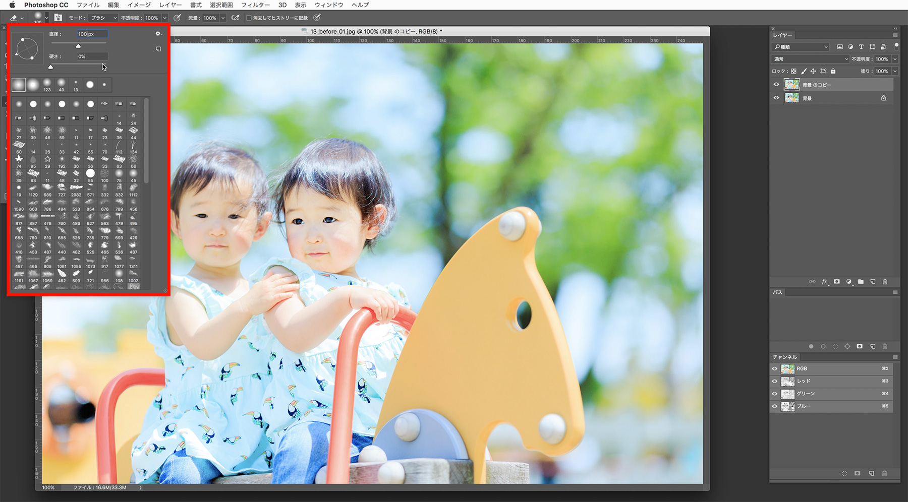 [ツールパネル]で[消しゴムツール]を選択し、[オプションバー]で消しゴムの形を[直径]100px[硬さ]0% 程度にそれぞれ設定します。