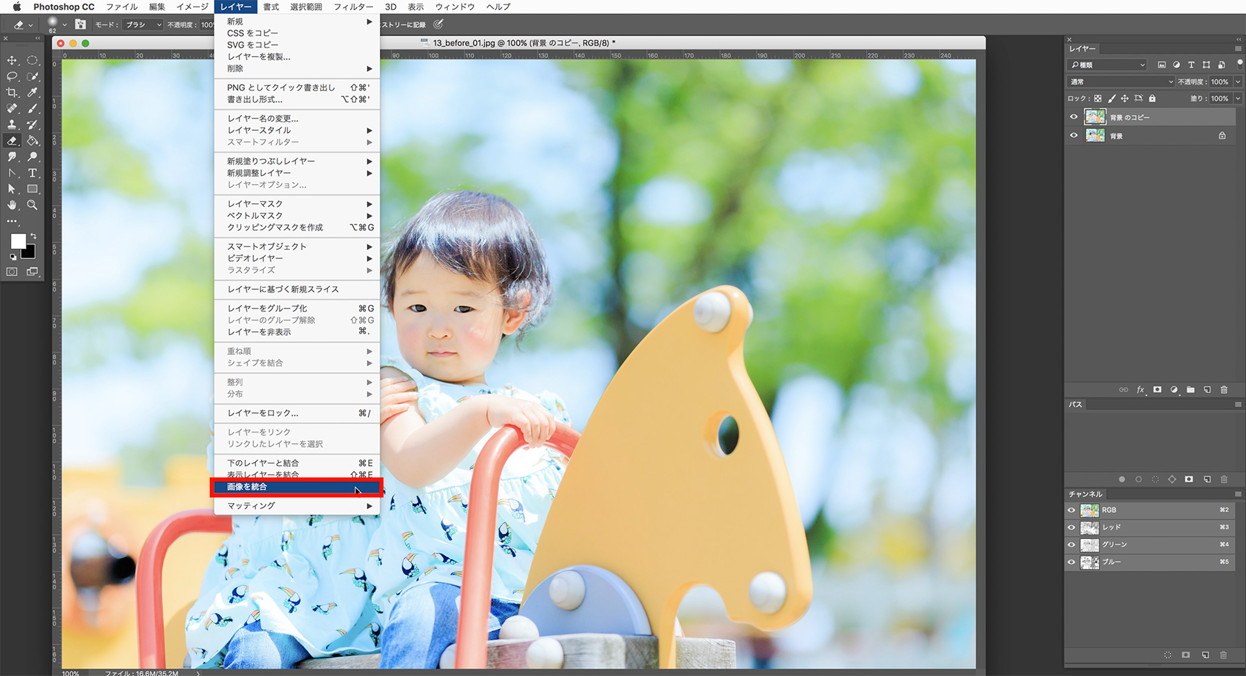 アプリケーションメニューの[レイヤー]→[画像を統合]をクリックしてレイヤーを統合します。