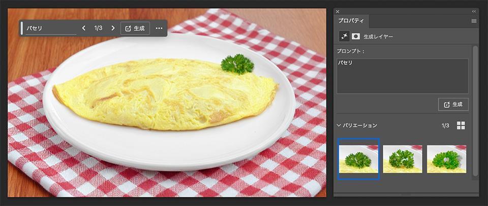 「生成塗りつぶし」のボタンをクリックして、プロンプトフィールドに「パセリ」と入力して、生成します。