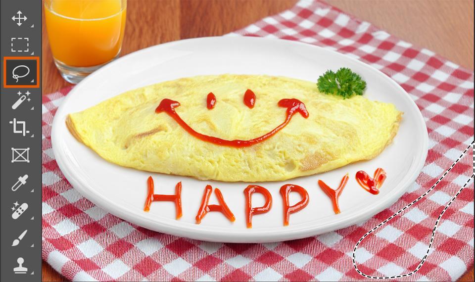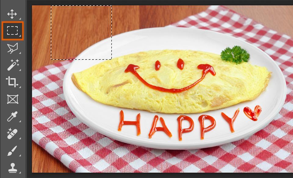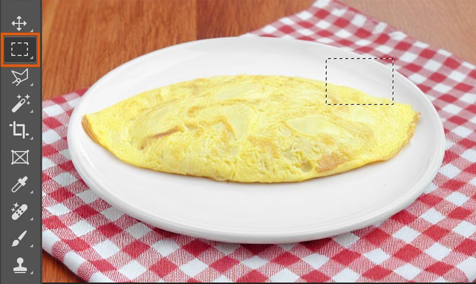 長方形選択ツールに切り替えて、オムライスの右上に選択範囲を作成します。