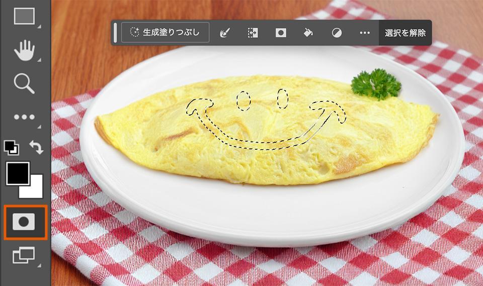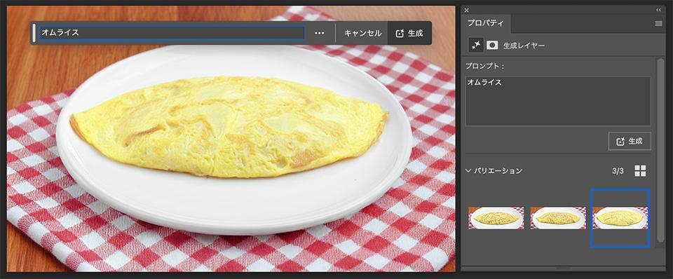 選択範囲ができたら「生成塗りつぶし」をクリックして、プロンプトフィールドに「オムライス」と入力して生成します。