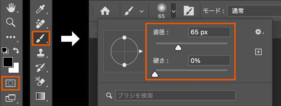 ブラシツールに切り替えて、オプションバーから直径「65px」硬さ「0%」に設定します。ブラシのカラーは、ブラックにしておきます。
