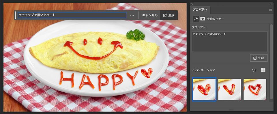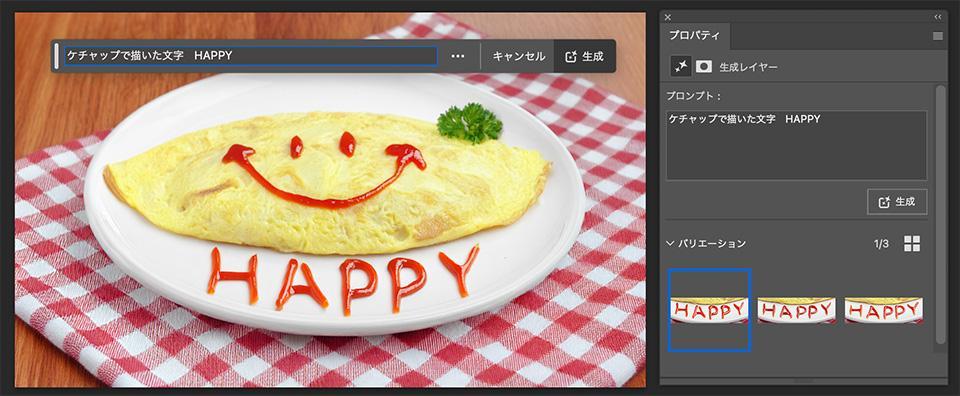 次は、お皿の上にケチャップで描いた「HAPPY」という文字を生成します。