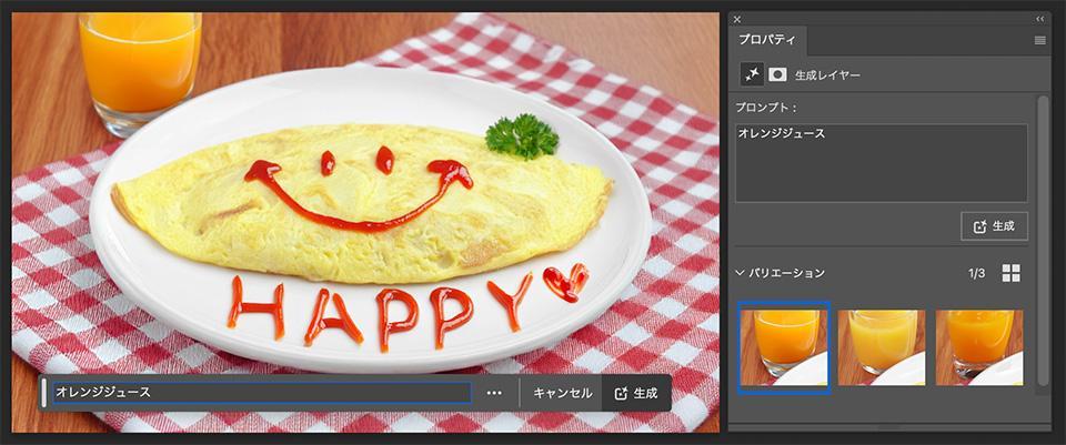 「生成塗りつぶし」のボタンをクリックして、プロンプトに「オレンジジュース」と入力して生成します。