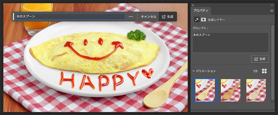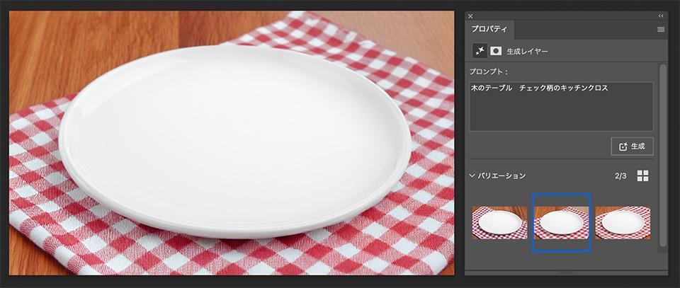 これだけで「木のテーブルと、キッチンクロス」を生成することができました。プロパティーパネルに3つのバリエーションが表示されるので、好きなバリエーションを選びましょう。欲しい画像がない場合は、もう一度生成のボタンをクリックして、新たなバリエーションを追加することができます。