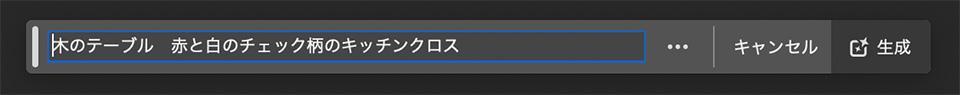 これで背景の選択範囲ができたので、コンテキストタスクバーから「生成塗りつぶし」のボタンをクリックして、プロンプトボックスに「木のテーブル 赤と白のチェック柄のキッチンクロス」と入力して、生成のボタンを押します。