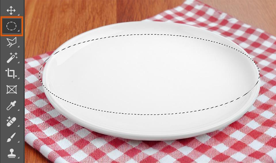 楕円形選択ツールに切り替えて、お皿の上に選択範囲を作成します。