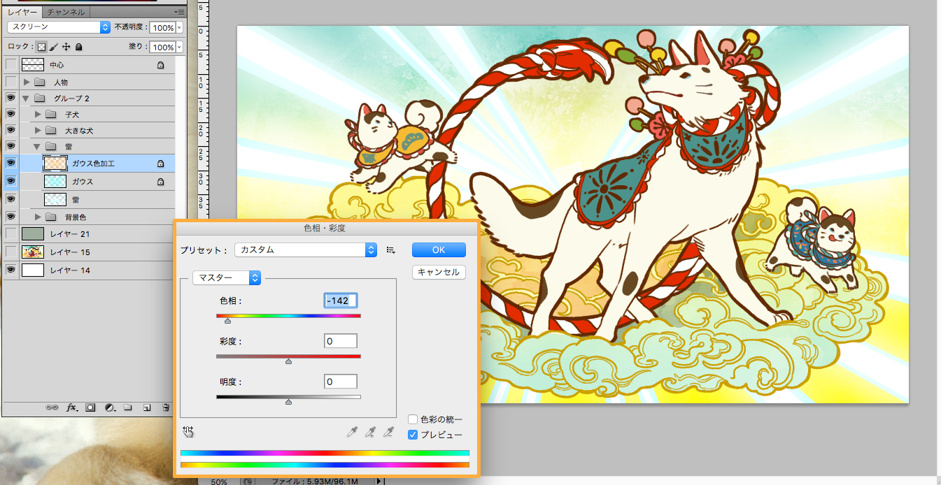 ぼかしたレイヤーをコピーし、[メニュー]→[イメージ]→[色調補正]→[色相・彩度]から色を調整して強い発光を表現します。
