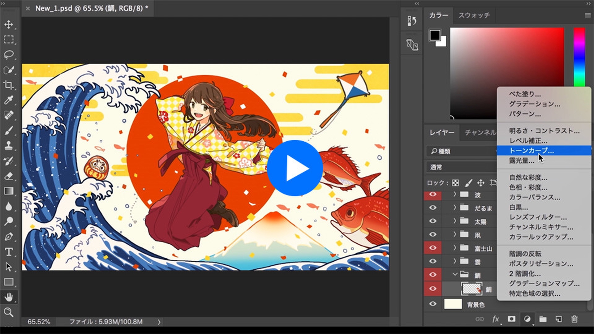 調整したいパーツを選択し、[メニュー]→[レイヤー]→[新規調整レイヤー]→[トーンカーブ]を選択します。属性パネルから画面の配色がまとまるように各パーツの色を調整していきます。ここではレッド、ブルーをメインに調整しています。