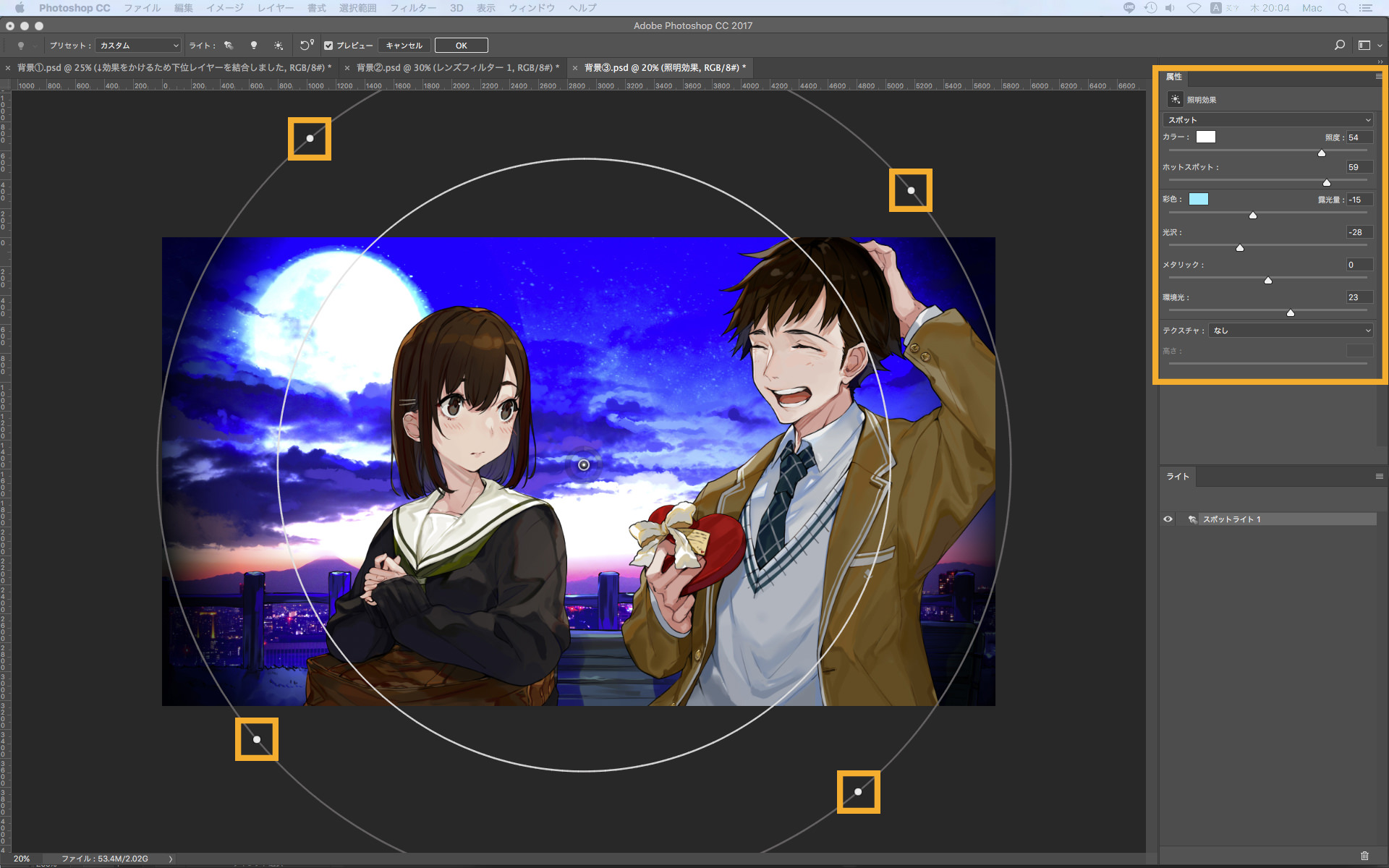 照明効果を使用するために背景のレイヤーを結合します。結合した背景レイヤーを選択し、[メニュー]→[フィルター]→[描画]→[照明効果]からふたりに光が当たるように調整します。画像の上に二重丸が表示されました。外側の円上にある四つの点をドラッグすることで光の大きさや幅を調整できます。次に、全体に逆光の効果をかけるためにキャラクターと背景の両方のレイヤーを結合します。