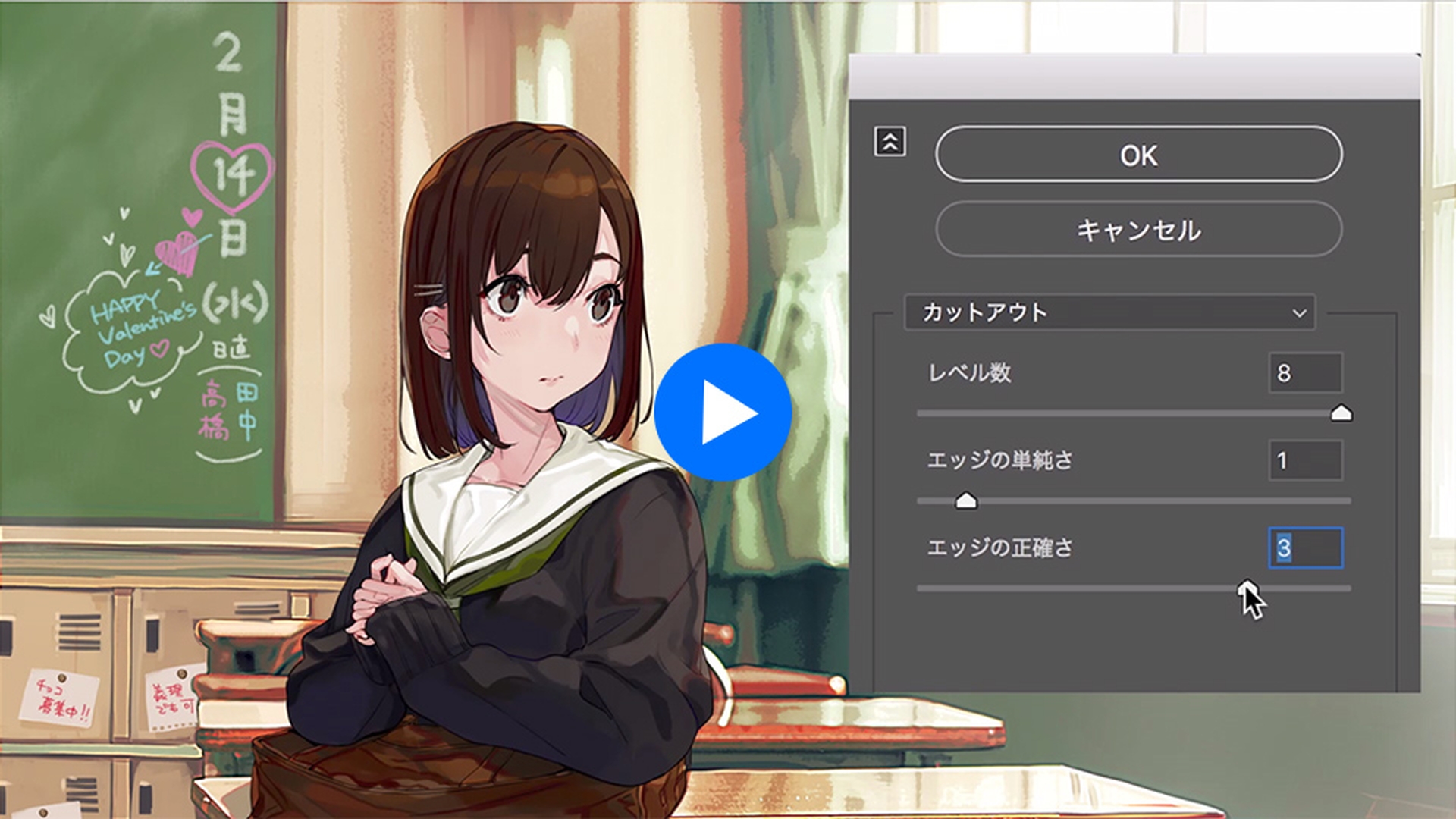 結合したレイヤーを選択し、[メニュー]→[フィルター]→[フィルターギャラリー]を選択します。ダイアログボックスが表示されるので、サブメニューの「アーティスティック」を開き「カットアウト」を選択します。プレビューに表示されている写真の色数が減り、色紙を貼り付けたような画像になりました。