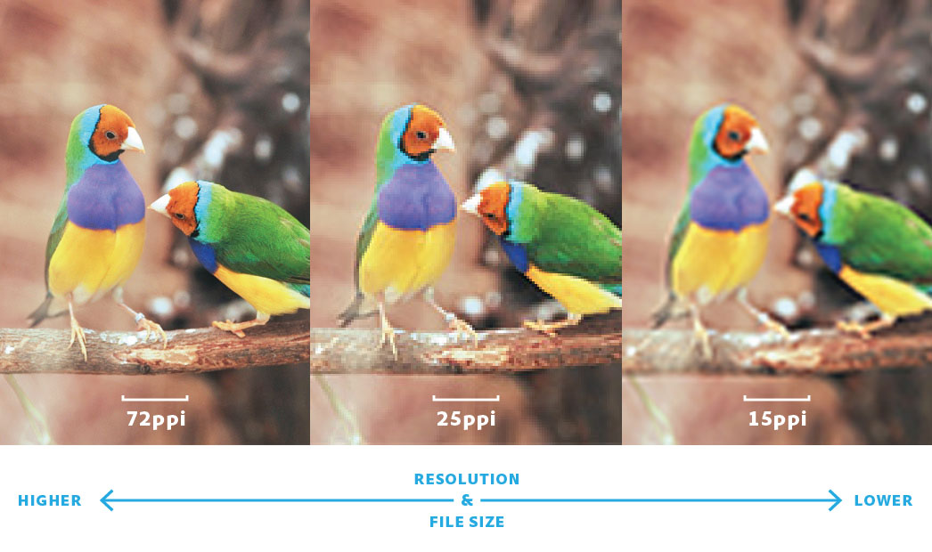 解像度が高い(ディテールが細かい)ほど、ファイルサイズが大きくなります。画像を元の縦横ピクセル寸法よりも大きいサイズに変更すると、ピクセルが目立つようになったりぼやけたりします。