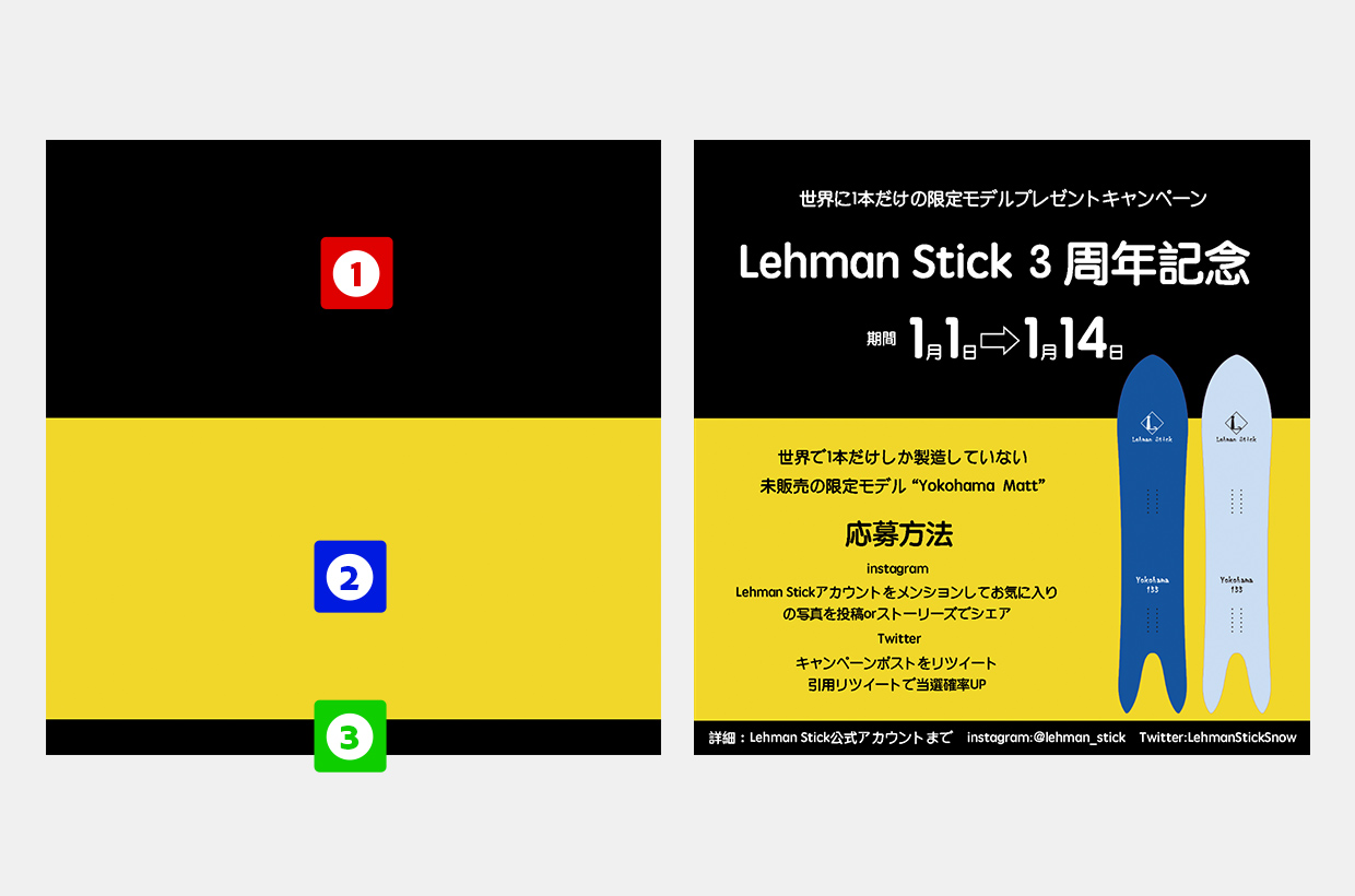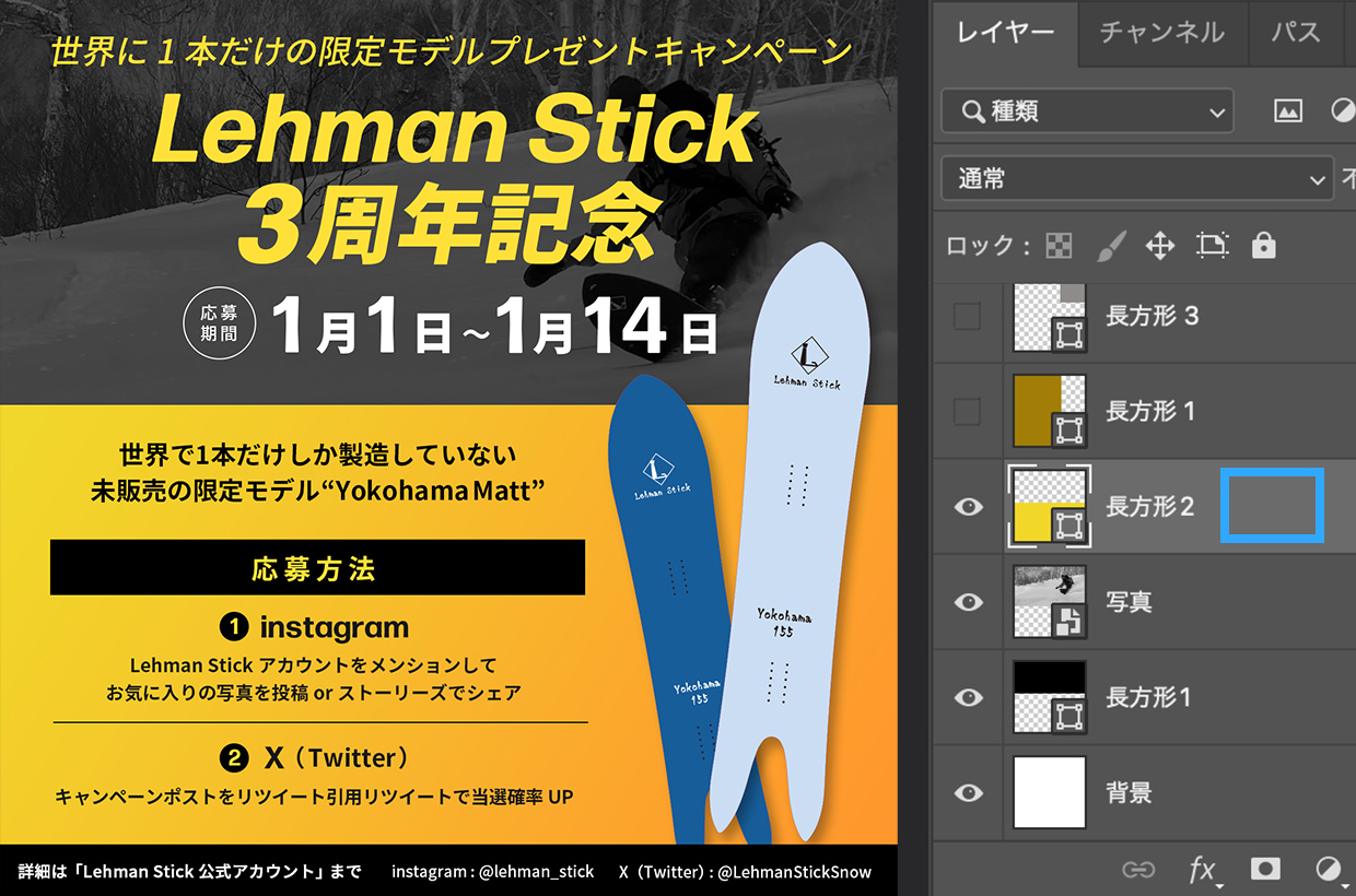 まずは背景以外、すべてのレイヤーを非表示にします。長方形ツールに切り替え、3つのエリアを区切っていきます。色は青いボードが目立つように、黒と黄色(##FFE329)で構成します。