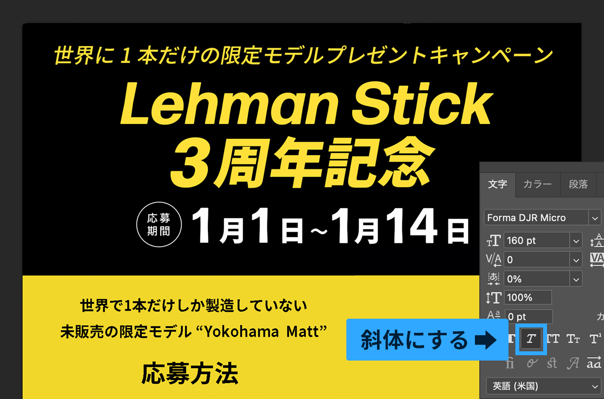 タイトルとキャッチコピーが目立つように、文字色を「黄色」にします。タイトルは「斜体」にして、さらに他の文字と差別化します。