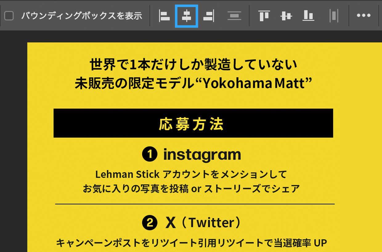 応募方法の情報を全て選択し、オプションバーから中央揃えにします。応募方法は2つあるので、番号をつけて分かりやすくします。