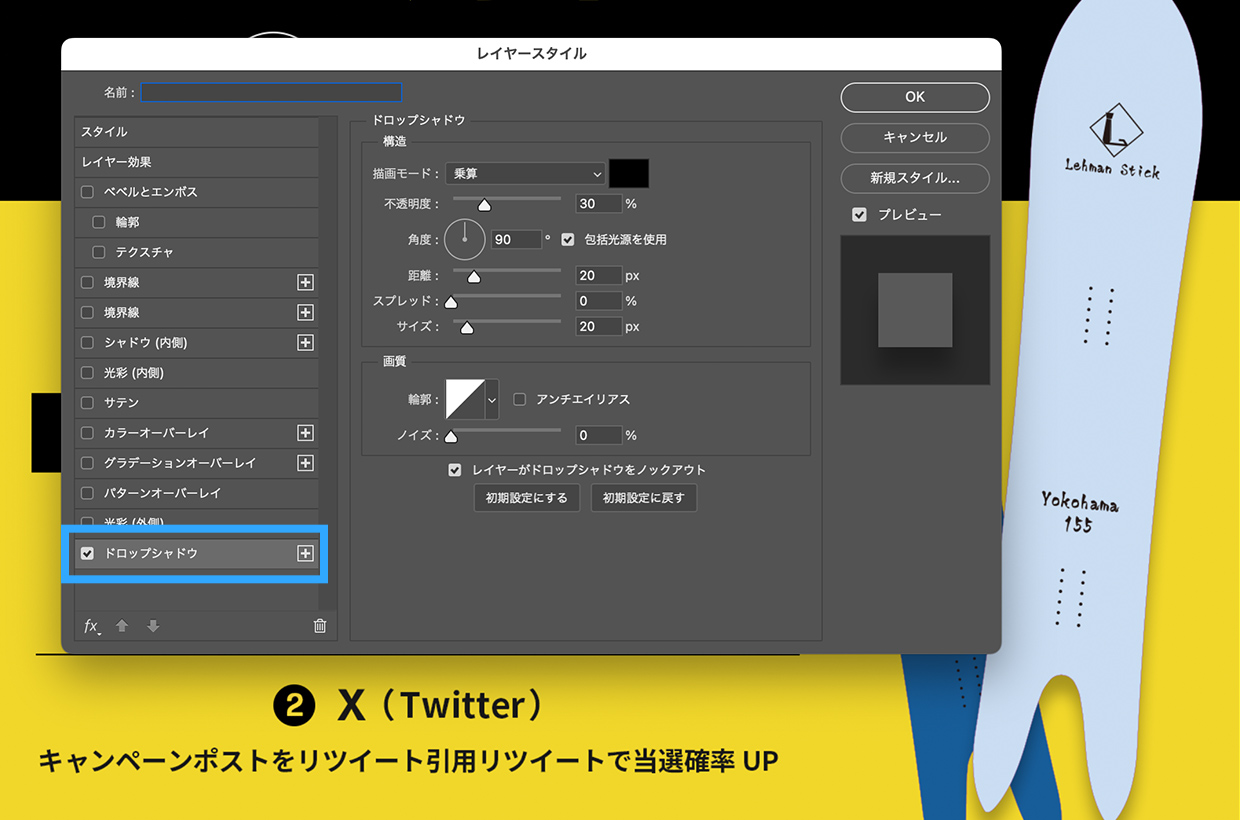 レイヤーパネルから、水色のボードのレイヤーの右をダブルクリックしてレイヤースタイルを開きます。ドロップシャドウを選択して下記の設定を行います。