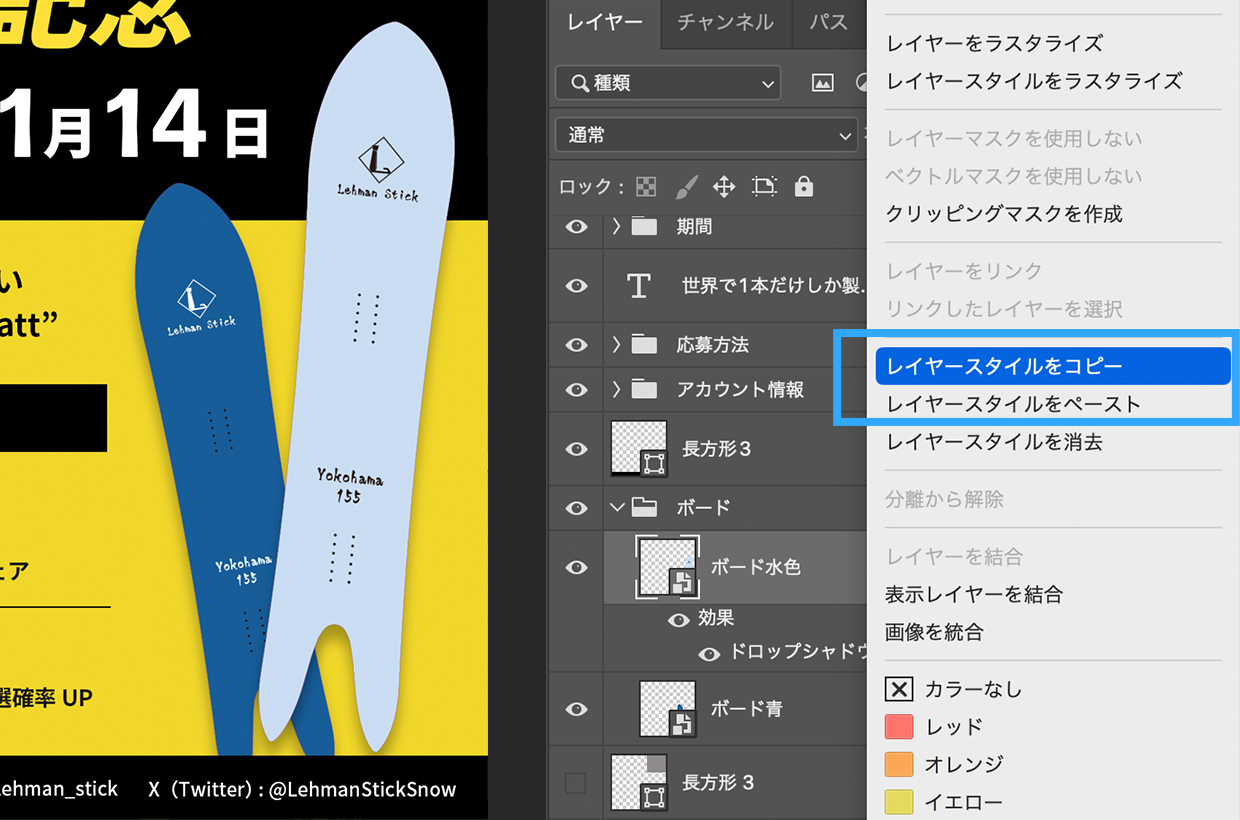 同じレイヤースタイルを適用したい時は「コピー&ペースト」が便利です。レイヤーパネルから右のボードを右クリックして、レイヤースタイルをコピーします。次に左のボードを選択して、右クリックからレイヤースタイルをペーストします。