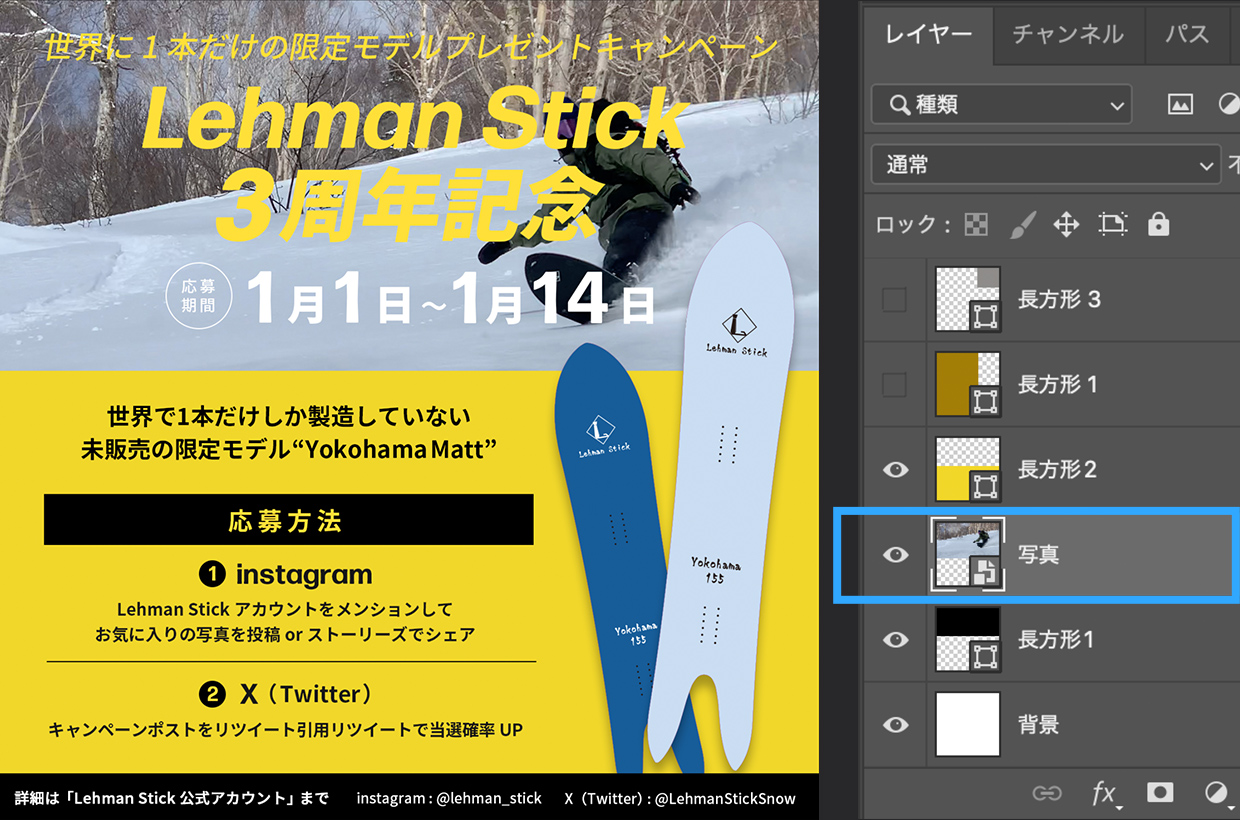 まずは、背景に薄く写真を入れる表現方法です。写真のレイヤーを表示して、黒の長方形の真上に来るようにレイヤーを移動します。