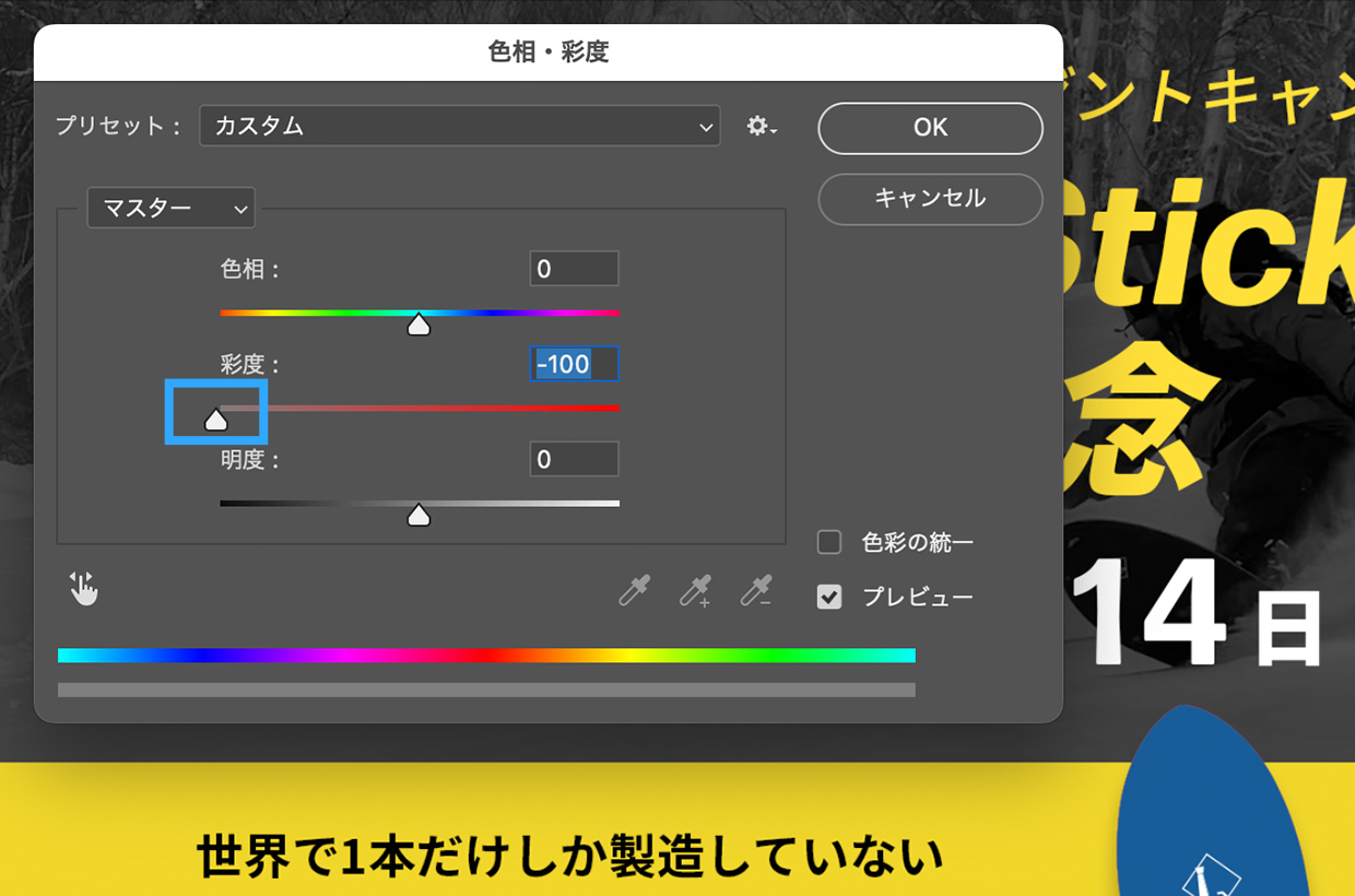 上のメニューから「イメージ」>「色調補正」>「色相・彩度」を開き、彩度のスライダーを「-100」にします。レイヤーパネルから不透明度を「35%」にして、薄く写真が見える状態にします。