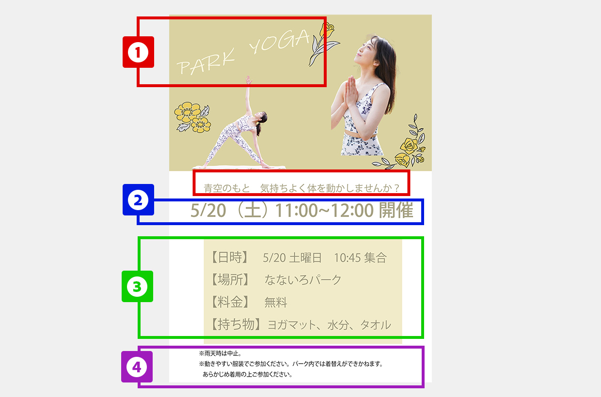 伝えたい情報に優先順位をつけて、メリハリのあるレイアウトにしていきましょう。①〜④の順に優先順位をつけてレイアウトを組み立てていきます。