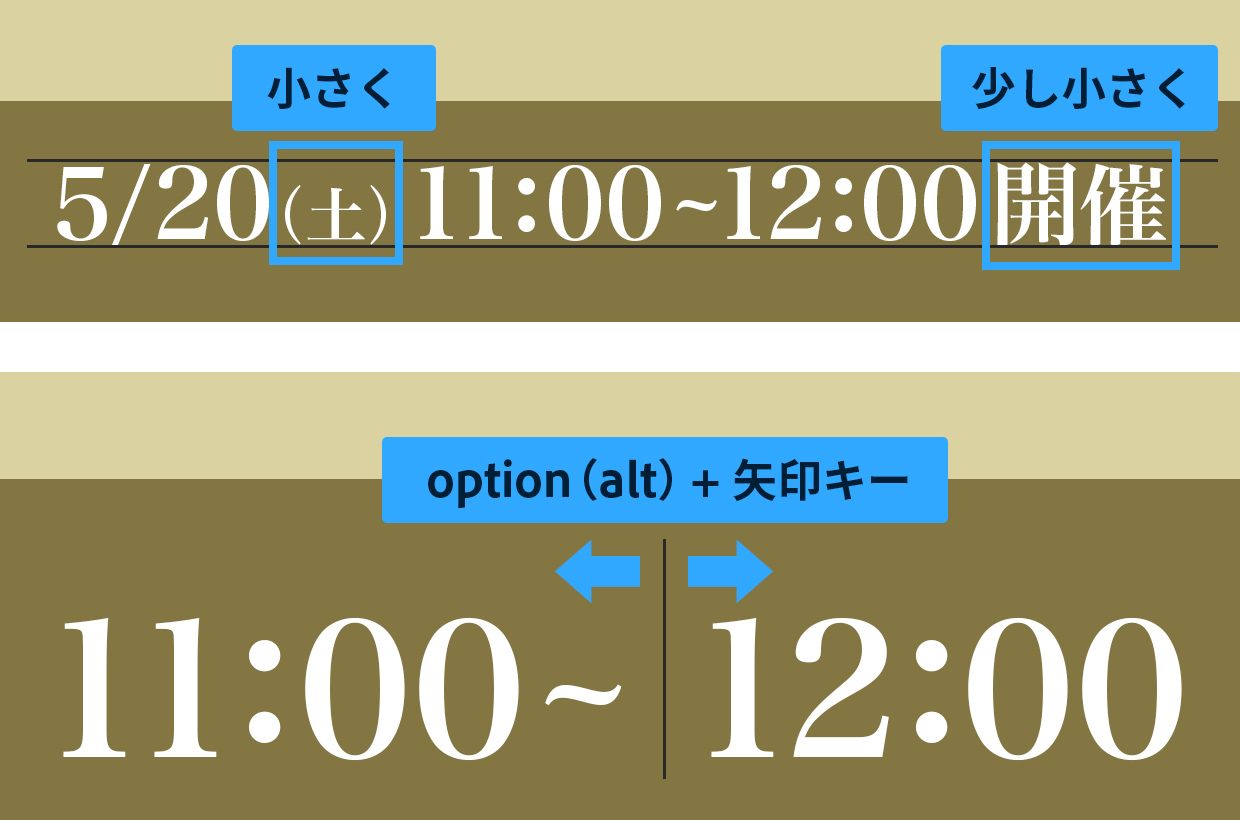 次は文字と文字の間隔を調整していきます。調整したい箇所にカーソルを合わせて、「option(alt)」を押しながら「左右の矢印キー」押すことで間隔を調整していきます。