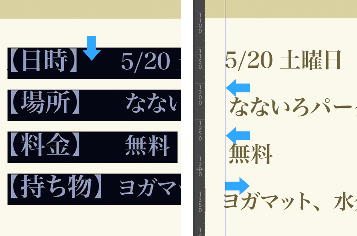 次は、文字の頭の位置にガイドを引いて、位置を揃えていきます。カーソルを文字の頭に合わせ、「option(alt)」を押しながら「左右の矢印キー」で調整します。