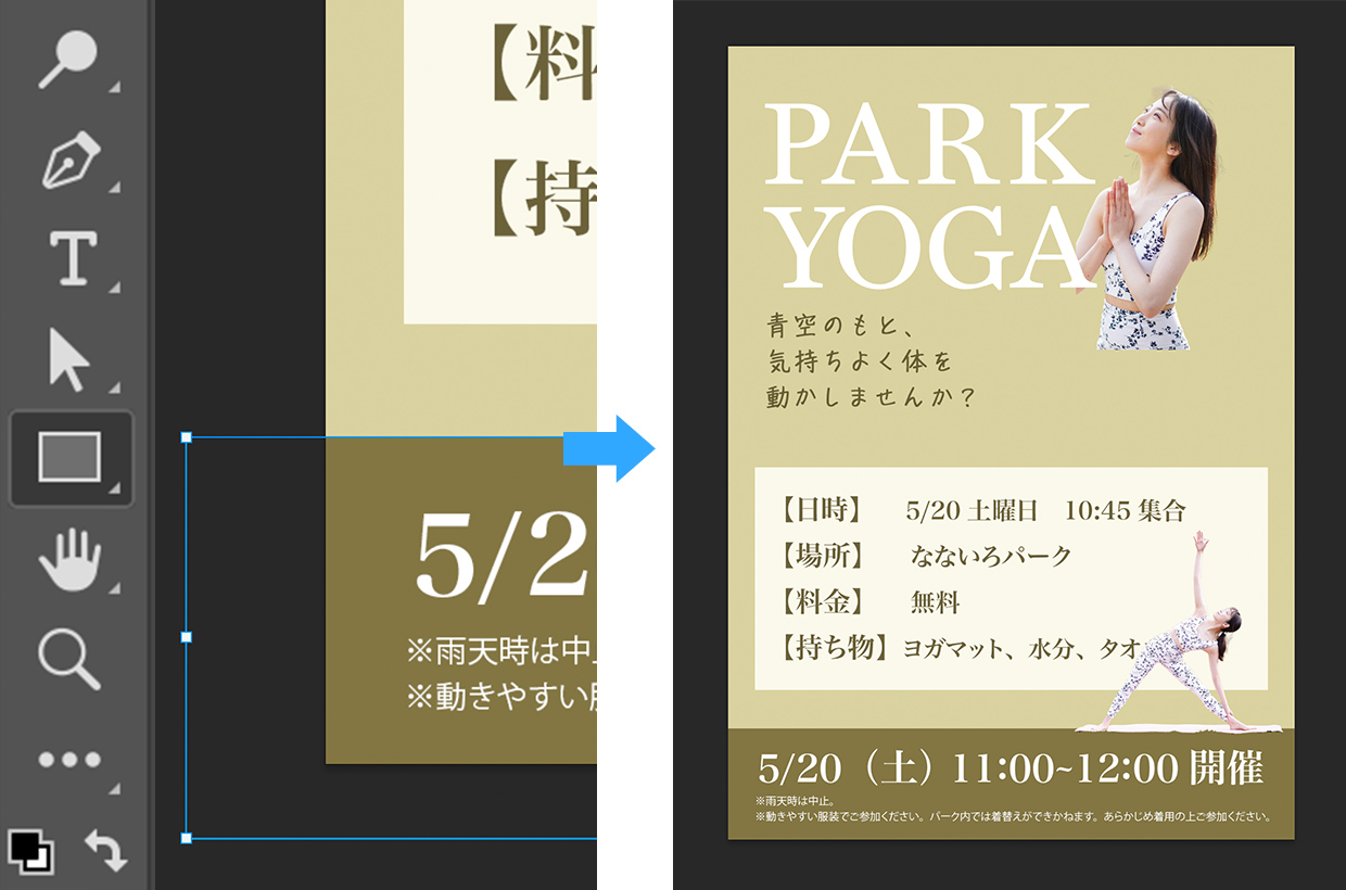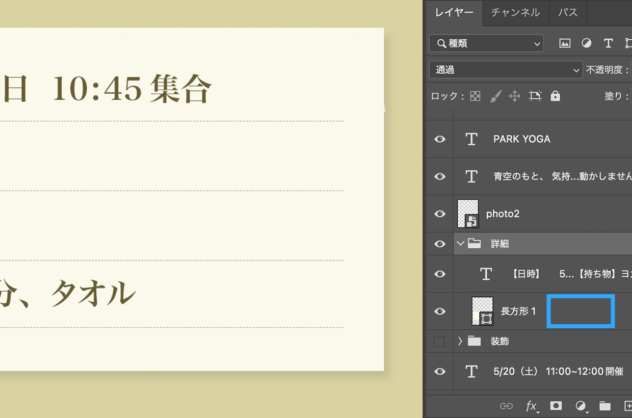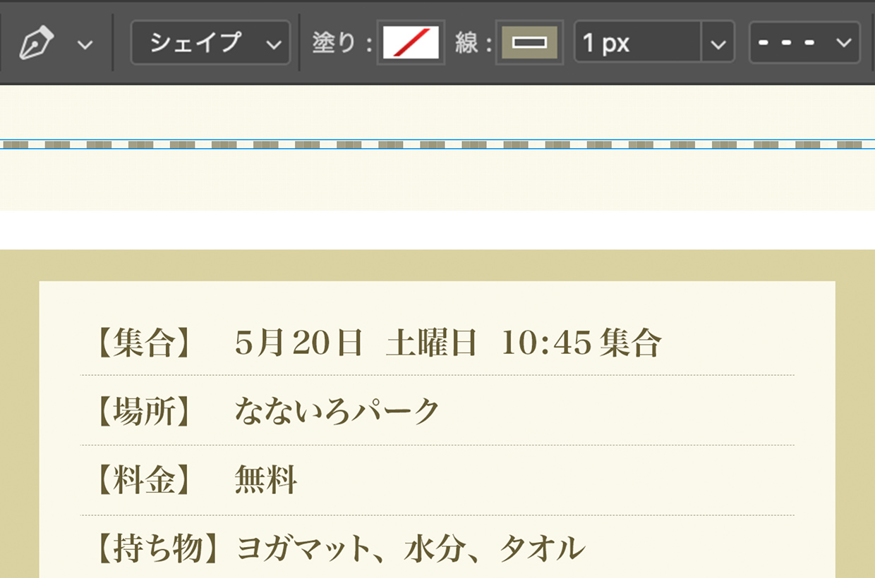 注意事項は小さくして、開催日時と同じグループにします。⻑方形ツールで文字の下に帯を配置し、カラーは「#837642」に設定し、さらに文字色を白にすることで目立たせます。
