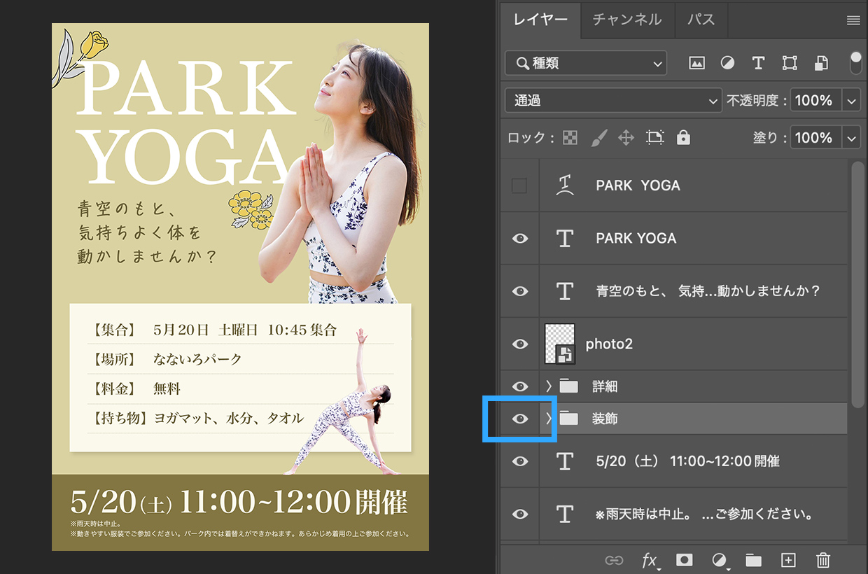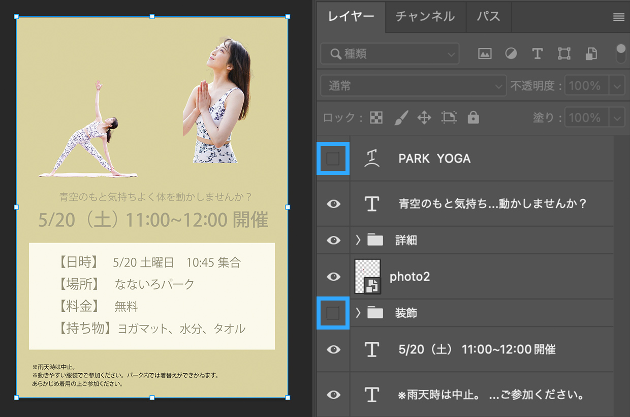 最後に、装飾のレイヤーを表示してタイトル周りに配置します。3つは多いので、1つ非表示にします。タイトルの可読性を損なわないよう注意しながら配置します。