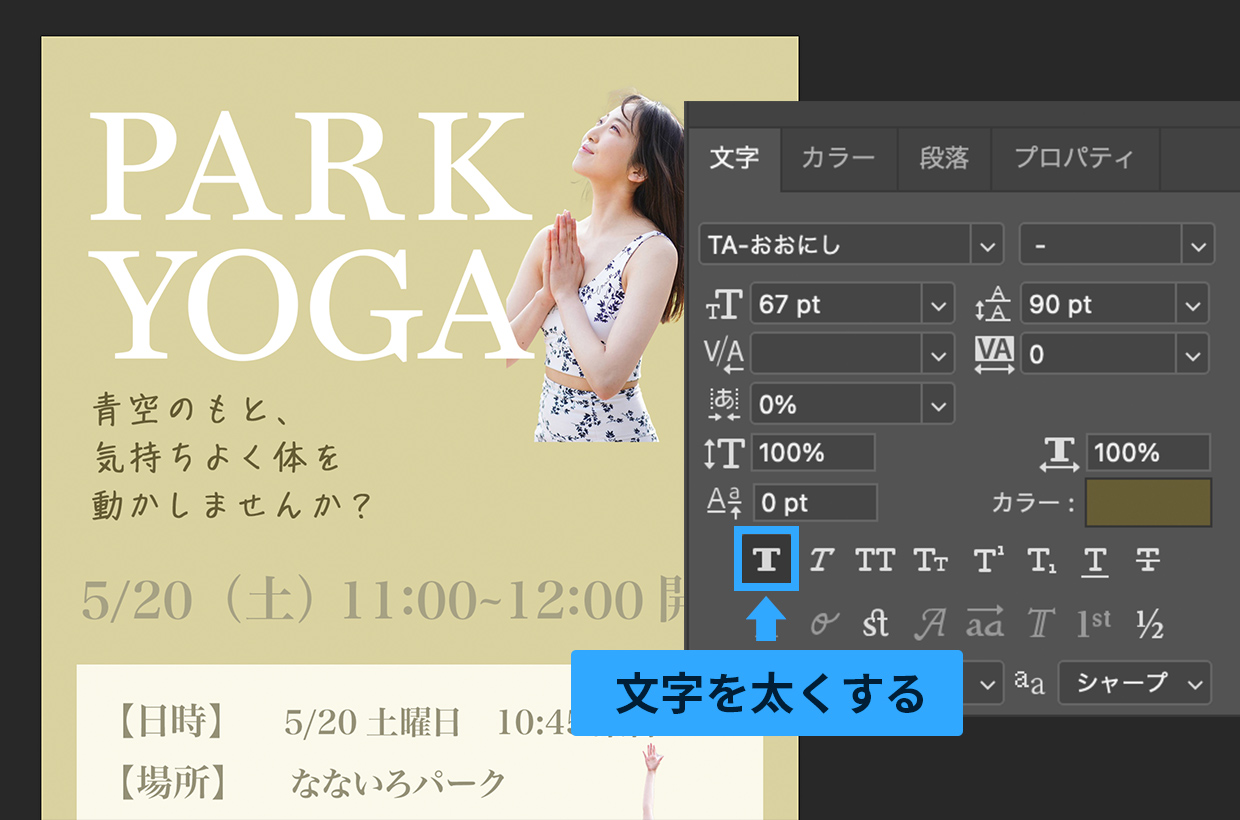 キャッチコピーは文字数が長いので、3行で配置します。他の文字と差別化するため、手書き風のフォント「TA-おおにし」を使用し、カラーは「#675d35」にします。文字の太さを太くします。