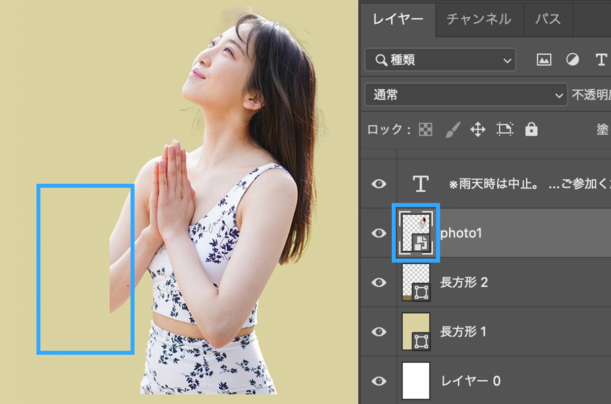 結合できたら上のメニューから「選択範囲」>「被写体を選択」をクリックし、人物の選択範囲を作成します。選択範囲ができたら、レイヤーパネルからクリッピングマスクを作成します。