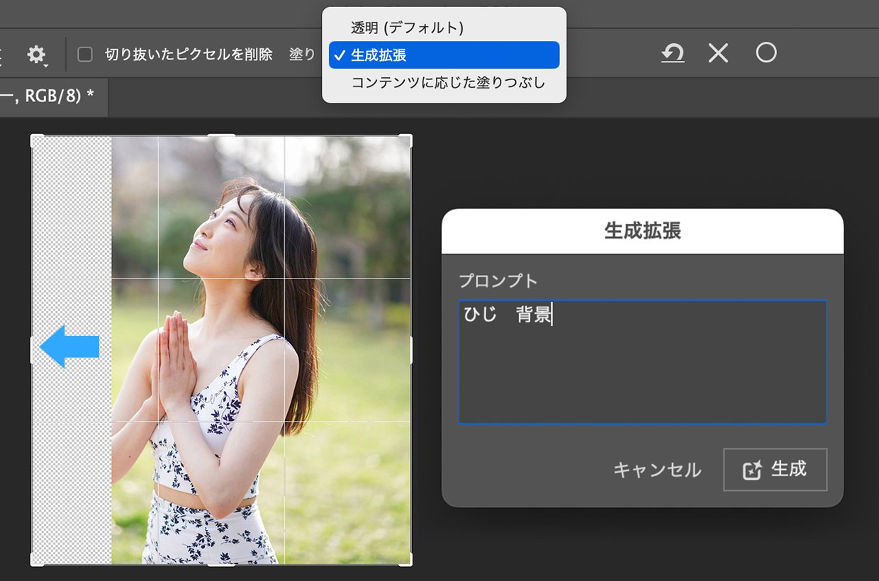 オプションバーの塗りを「生成拡張」にして「○ボタン」を押すと、生成拡張の画面が開くので、プロンプトの欄に「ひじ 背景」と入力して生成ボタンをクリックします。