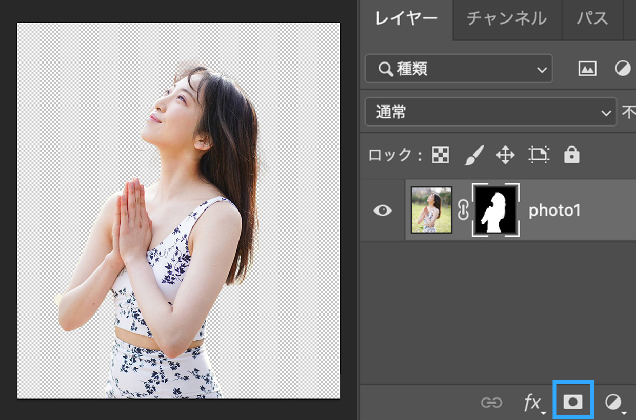 別のタブで人物画像を開くことができたら、画像レイヤーに適用してあるマスクを、ゴミ箱のアイコンまでドラッグして削除します。(レイヤーを削除する前にマスクを適用しますか?)の選択では「削除」を指定します。