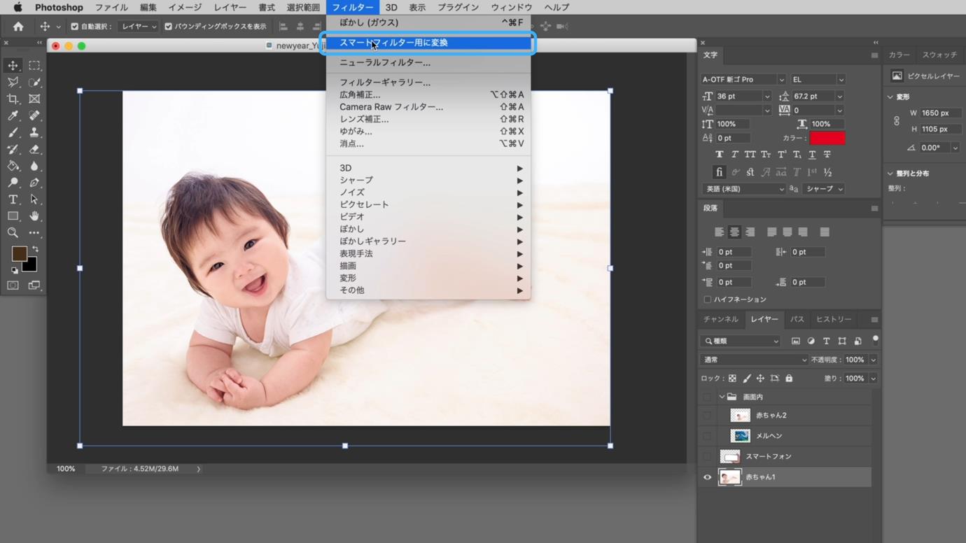 画像をスマートオブジェクト化しておくことで、フィルター等を適用しても後から何度でもやり直しが可能となります。