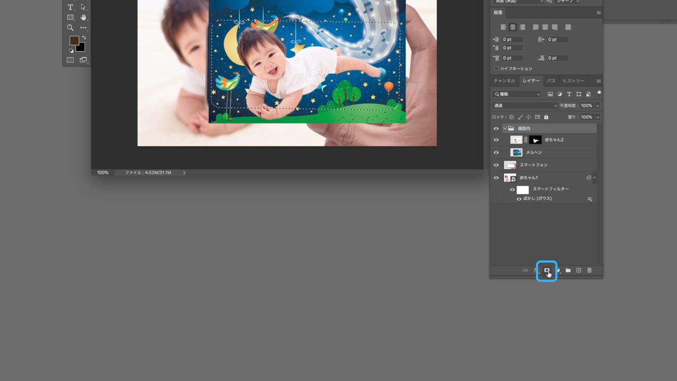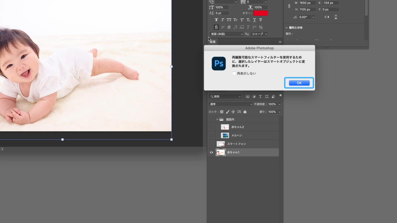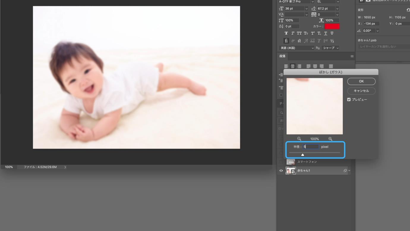 再背面の「赤ちゃん1」レイヤーのみが表示された状態でファイルが開きます。まず、「赤ちゃん1」レイヤーをスマートオブジェクト化して、ぼかしを設定しましょう。ここでは、スマートフォンに表示させる写真にフォーカスしたいので写真をぼかしていますが、使用する写真によってはぼかしを入れなくてもOKです。