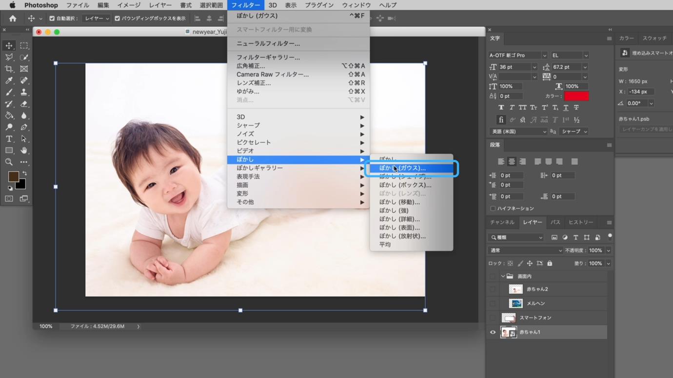 3 「フィルター」メニューから「ぼかし」→「ぼかし(ガウス)」を選択します。