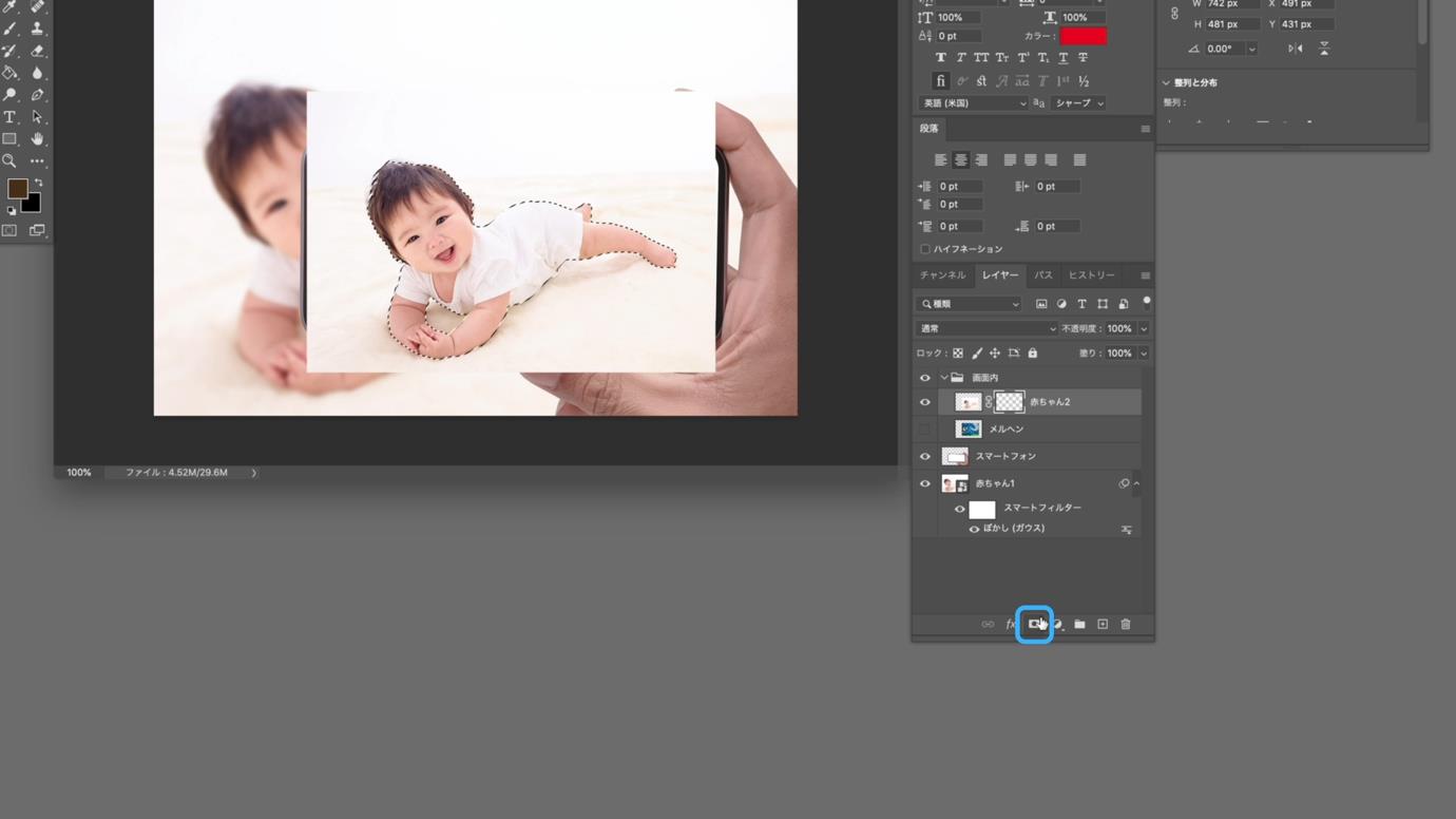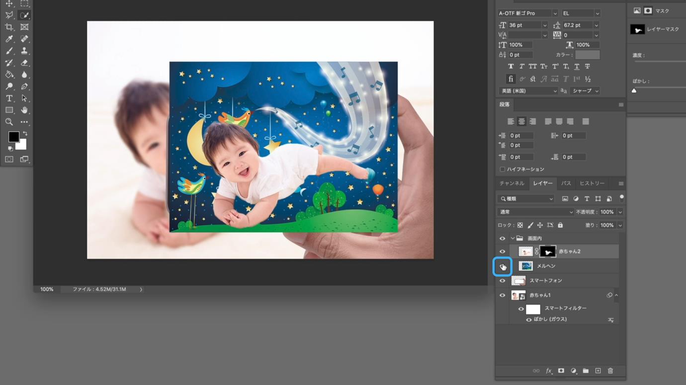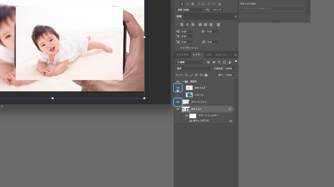 「スマートフォン」レイヤーと「赤ちゃん2」レイヤーを表示させます。