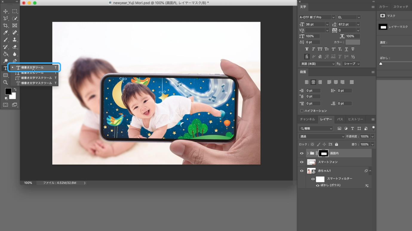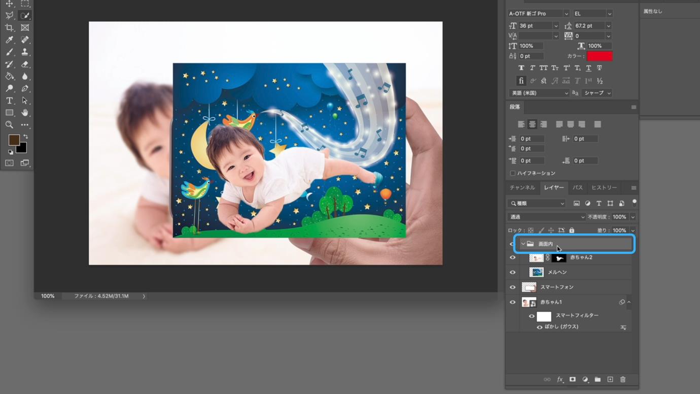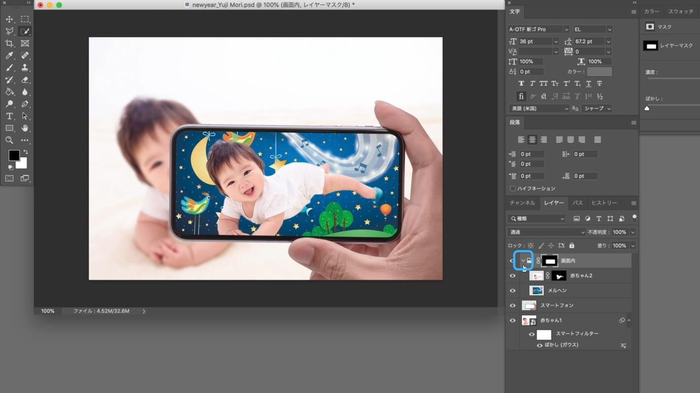 「スマートフォン」レイヤーと「赤ちゃん2」レイヤーを表示させます。