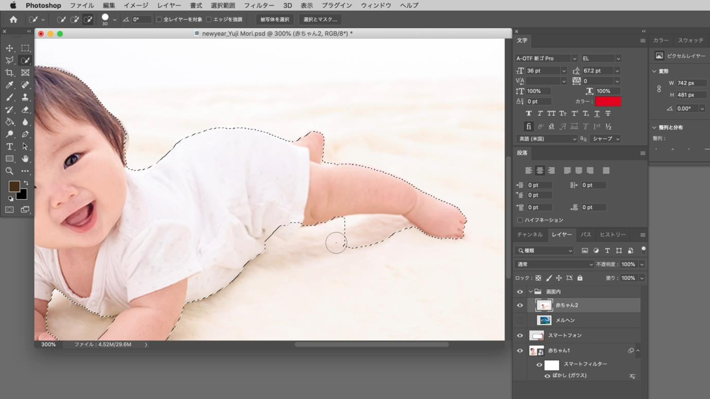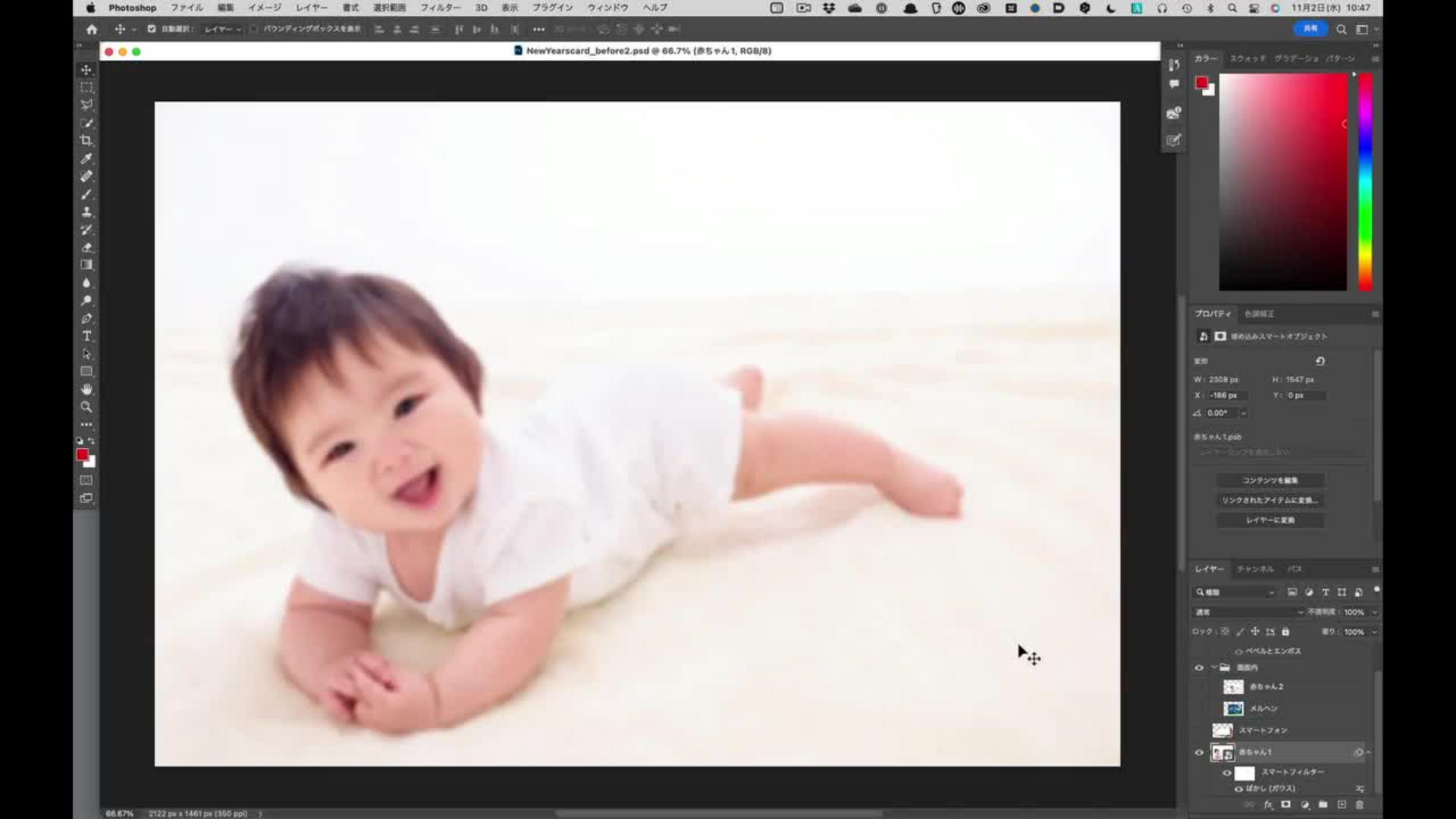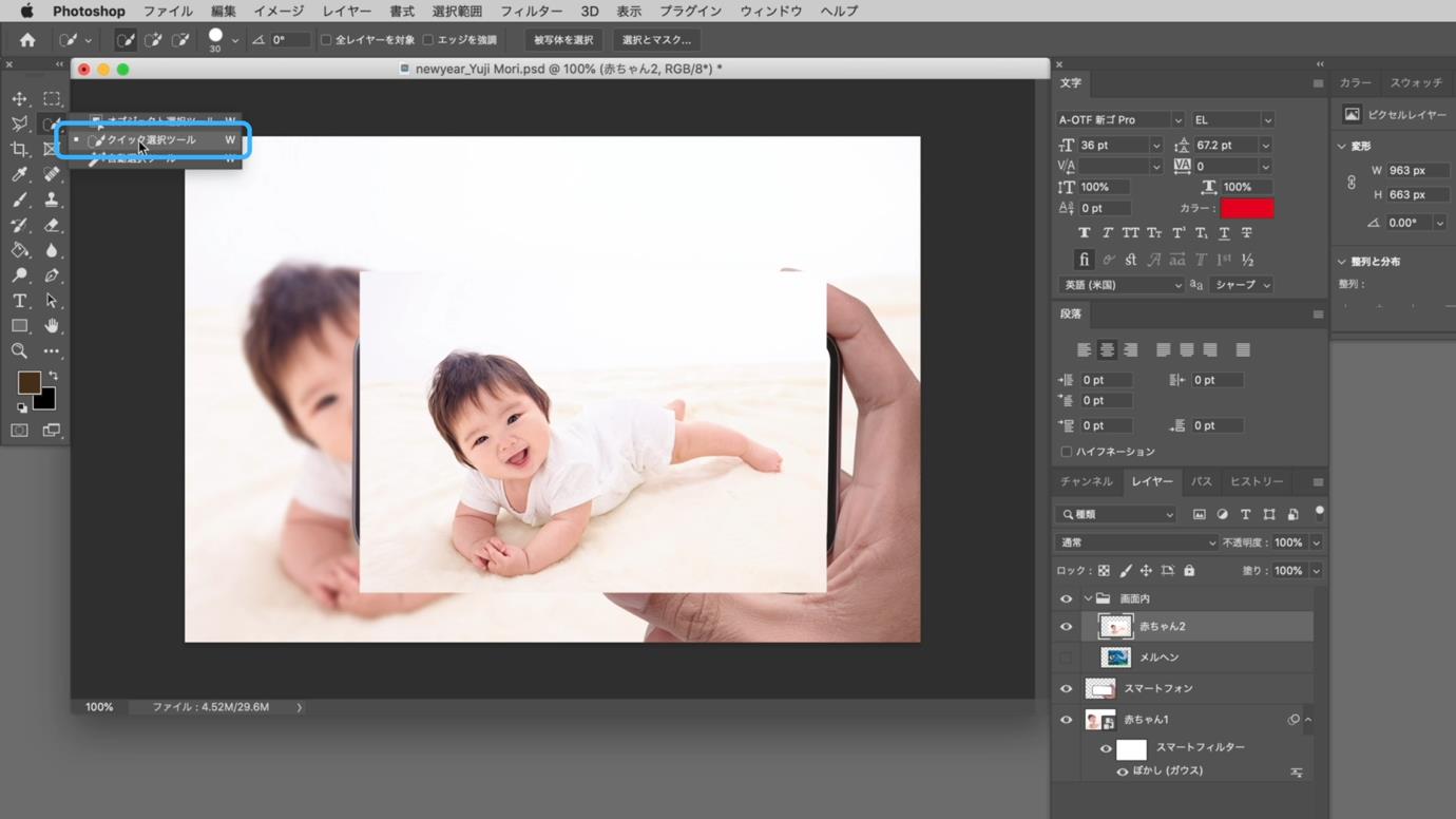 1 「スマートフォン」レイヤーと「赤ちゃん2」レイヤーを表示させます。