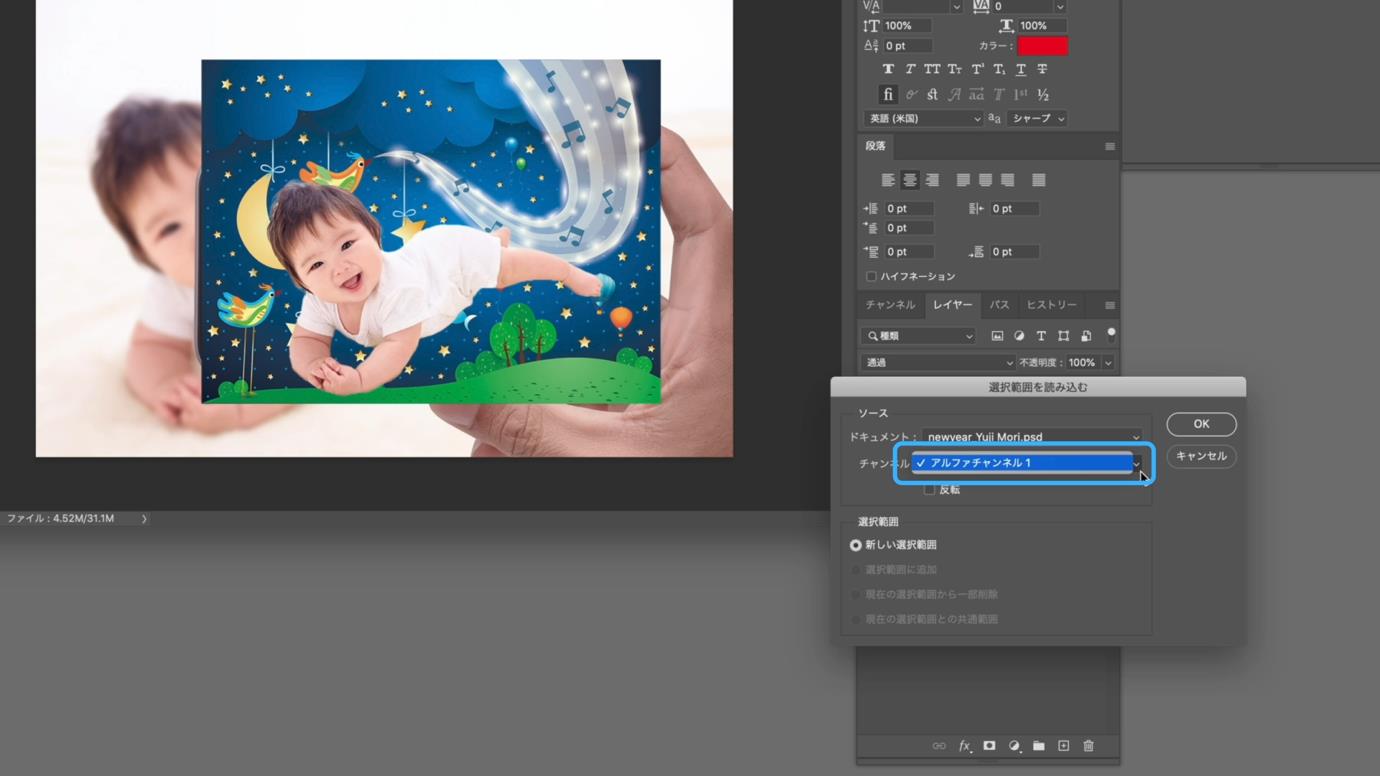 4 「選択範囲を読み込む」を表示させます。「チャンネル」に「アルファチャンネル1」を選択し、「OK」ボタンをクリックします。