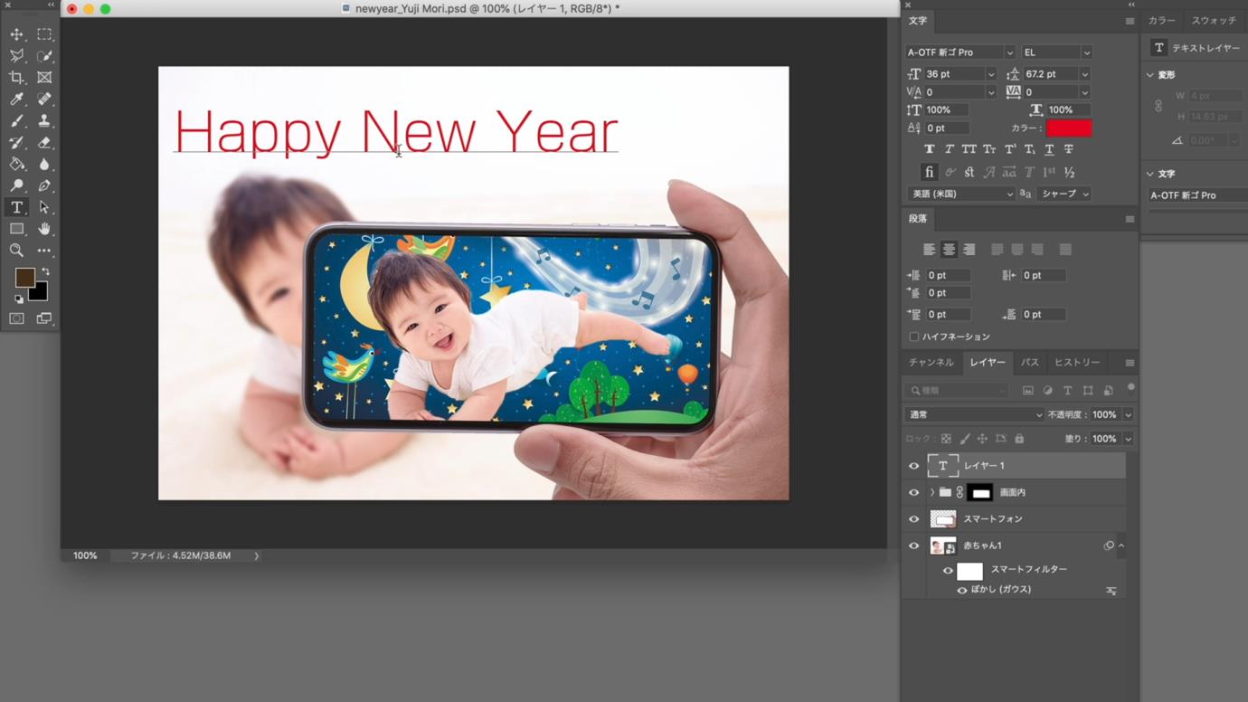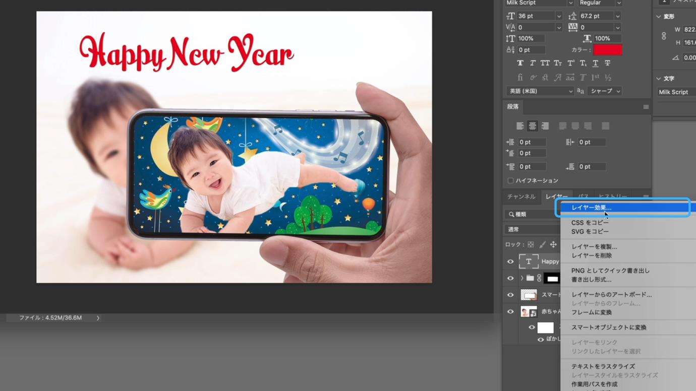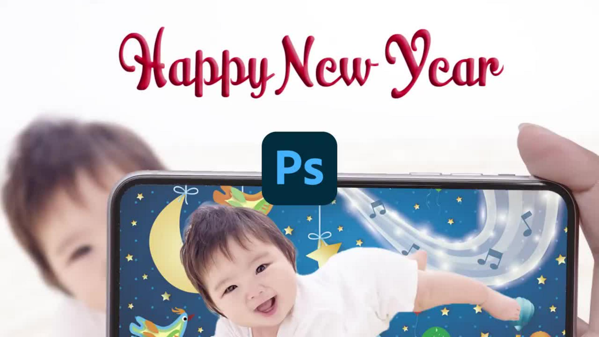 ここでは、新しく産まれた赤ちゃんの写真を使用して年賀状を作ります。サンプルをご覧いただくと分かりますが、実際の赤ちゃんの画像と、それを映しているスマートフォンの画像の背景が異なっているのが分かります。スマートフォンの画像の背景を、ちょっとメルヘンな雰囲気の背景に替えるだけで、楽しそうな雰囲気が伝わりますよね。このように、実際の世界とスマートフォンに映る世界を変えることで、面白い年賀状ができると思います。