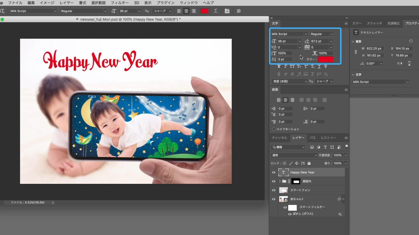 非表示となっている一番上のレイヤーの作例では、「フォント:Milk Script」「サイズ:36pt」「カラー:赤」としています。