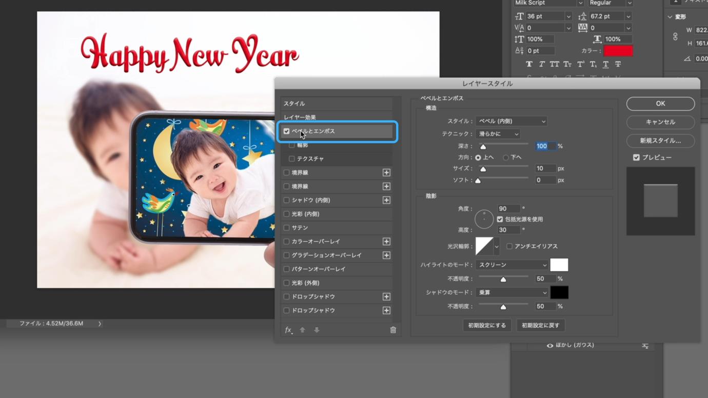 5 テキストレイヤーを選択して、「レイヤースタイルを追加」から「べベルとエンボス」を設定します。