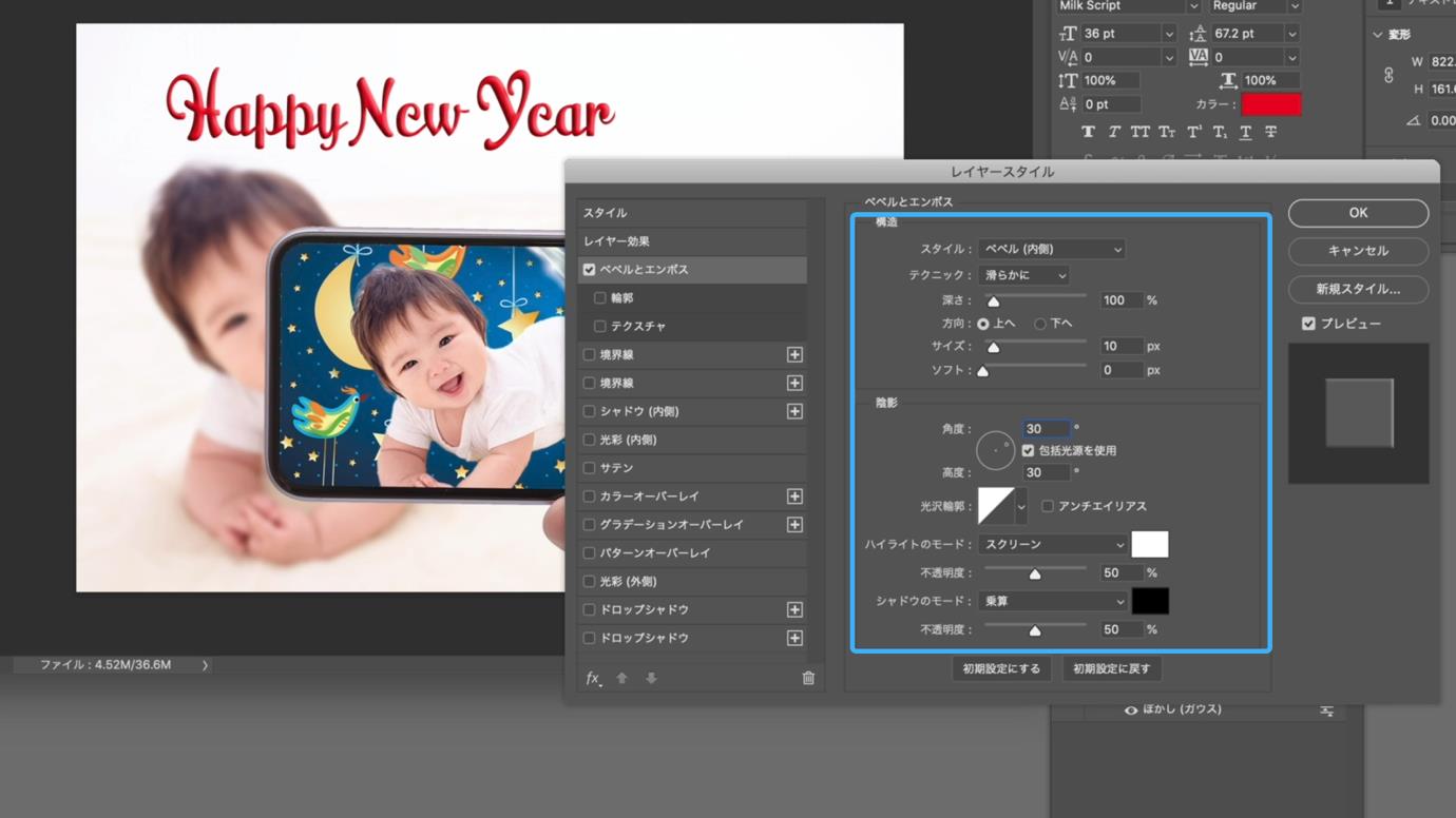 ここでは、「スタイル:べベル(内側)」「テクニック:滑らかに」「サイズ:10px」「角度:30°」を設定しました。